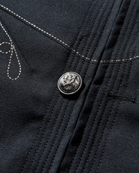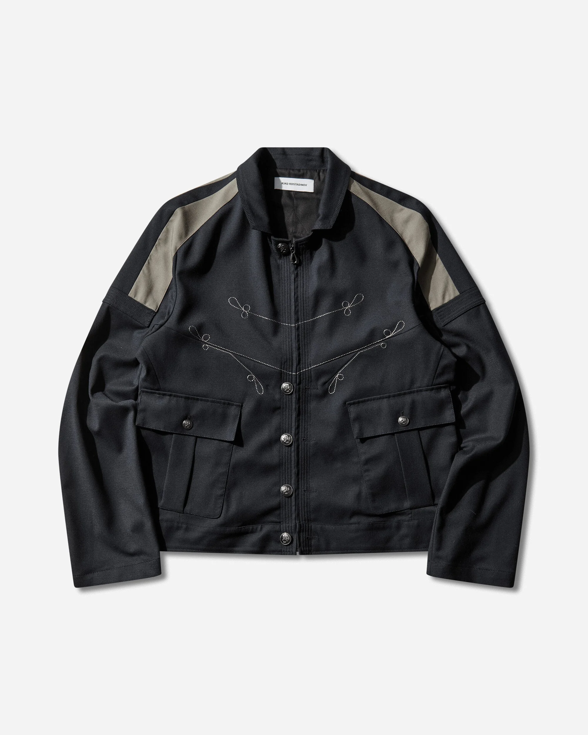 Kiko Kostadinov Fitz Military Blazer Dark Navy / Slate Grey The Fitz Military Blazer features intricate military inspired embroidery, and contrast paneling across the shoulders for a sculpted silhouette. A versatile front closure, allowing both zip or button fastening. Constructed with patch pockets with accessible side opening, finished with a pleated back panel. - 98% Virgin Wool, 2% Elastane - Lining: 100% Cotton - Regular Fit - Button and Zip Closure - Contrast Paneling - Military-Inspired Embroidery - Two Front Patch Pockets - Pleated Back Panel - Adjustable Hem - Style Code: KKAW25J02 30 SIZE & FIT Size Body Chest Sleeve Hem 46 62.5cm 56.5cm 66cm 56cm 48 63.5cm 57.5cm 67cm 58cm 50 64.5cm 59.5cm 68cm 60cm