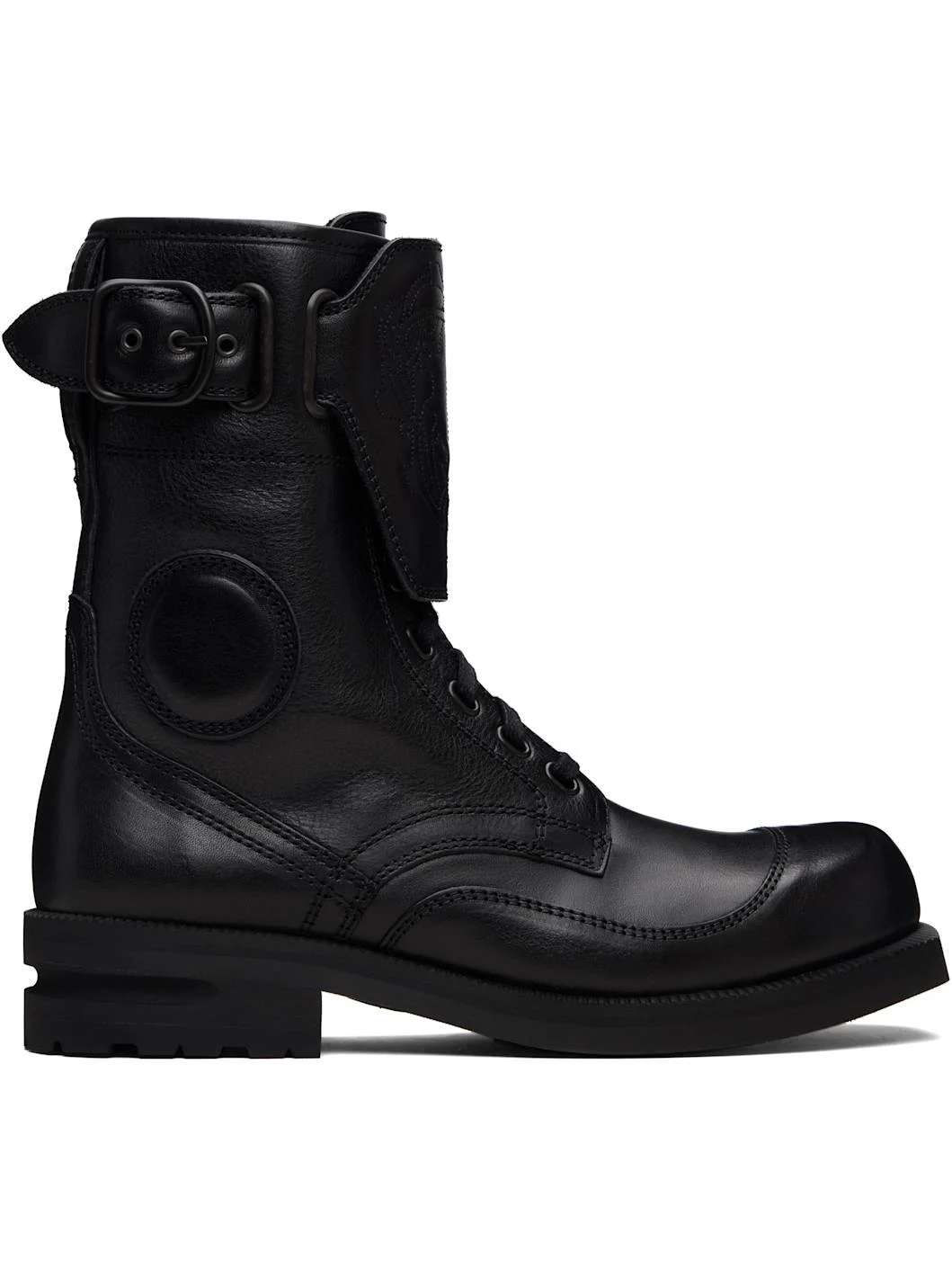 Mid-calf grained leather boots. · Lace-up closure · Logo graphic embroidered at vamp · Logo embossed at tongue · Pin-buckle strap at outer side · Serrated edge at welt · Treaded Vibram® rubber sole Supplier color: Petrol black Upper: leather. Sole: rubber. Made in Portugal 252985M255001