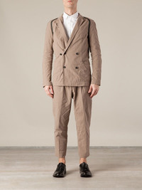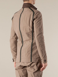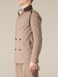 double breasted pinstripe blazer Beige pinstripe blazer from Kolor featuring notched lapels, a double breasted front fastening, patch pockets, long sleeves, button cuffs and contrasting brown seam detailing at the shoulders and rear. Imported Composition Nylon 97%, Polyester 3% Washing instructions Dry Clean Only