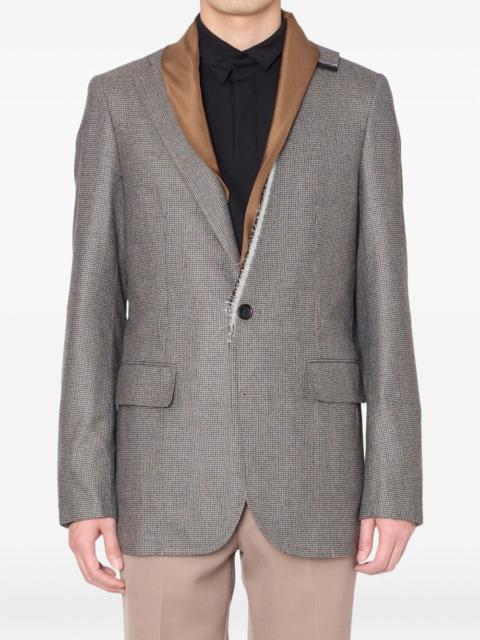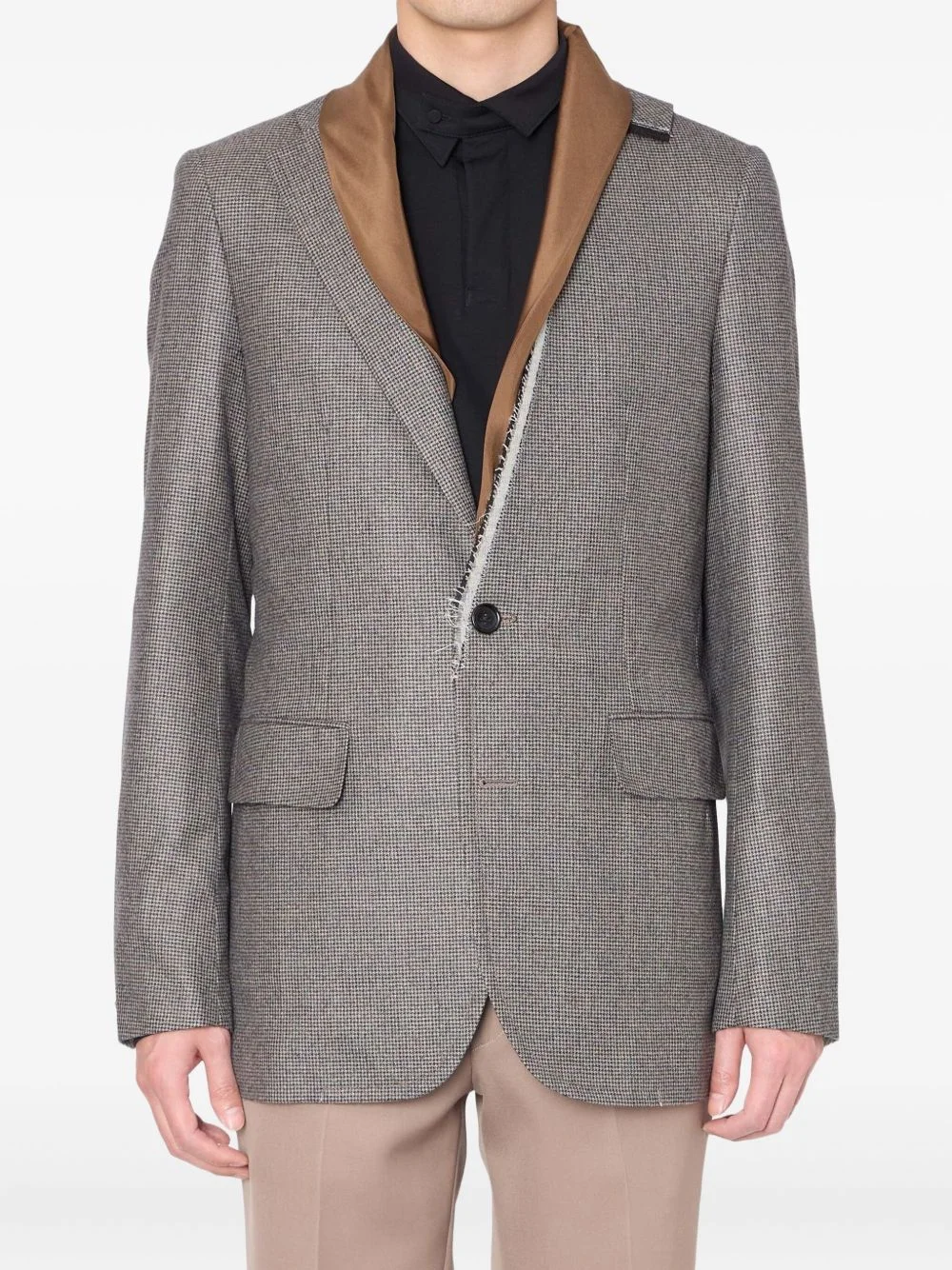 houndstooth frayed-edge blazer Highlights - Grey - Houndstooth pattern - Frayed edges - Single button fastening - Brown collar - Long sleeves Imported Composition Wool 98%, Polyurethane 2% Washing instructions Read Manufacturer Guidelines