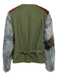 panelled jacket Highlights - Brick red/indigo blue/green - Washed denim - Corduroy - Contrasting panel detail - Front button fastening - Collarless - V-neck - Chest welt pocket - Two front welt pockets - Drop shoulder - Long sleeves - Faded effect - Distressed effect - Buttoned cuffs - Adjustable strap to the rear - Contrast lining Imported Composition Lining: Cotton 100%, Polyester 100% Outer: Sheepskin 100%, Cotton 49%, Polyester 27%, Wool 22%, Polyurethane 2%