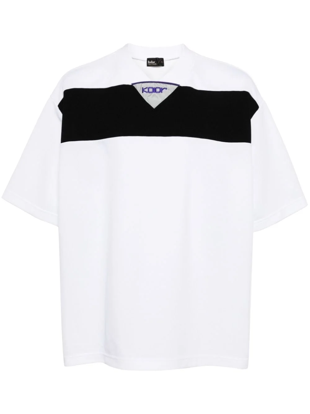 stripe-detail jersey T-shirt Highlights - White/black - Cotton blend - Jersey texture - Stripe detailing - V-neck - Short sleeves - Embroidered logo to the front - Straight hem Imported Composition Cotton 58%, Polyester 42%