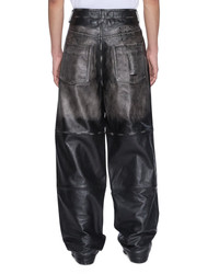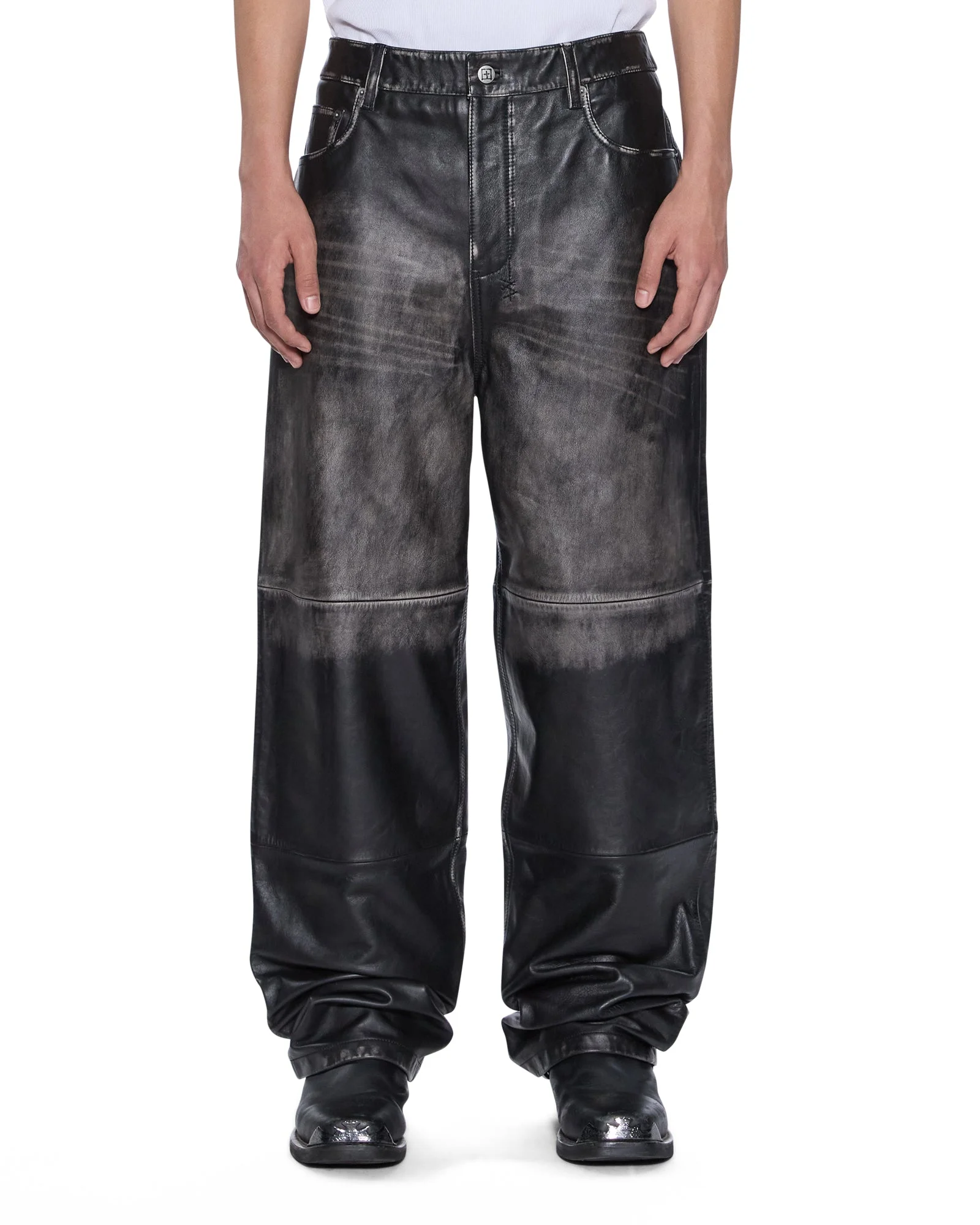 Blackjack Maxx Pant Aged Black is an exaggerated straight-leg jean with a long rise, crafted from tarnished black cow-hide mid-weight leather. Finished with signature Maxx T-box and 4x4 embroidery, and Ksubi branded hardware for a bold, elevated finish. FEATURES, SIZE & FIT - Exaggerated straight leg denim jean - Long rise - Button fly closure - Pockets - Waistband details - Hem/cuff detail - Ksubi t-box - Back 4x4 cross embroidery - Signature woven pocket tag - Branded hardware - No stretch - Shell: 100% calf leather - Lining: 100% polyester - Size 32 inseam: 79.5cm / 31 1/4" - Front rise: 34.5cm / 13 1/2" - Leg opening: 55cm / 21 3/4" - Model is wearing a size 30/M, height 181cm/6'0", chest 84cm, waist 68cm, hip 94cm - Professional leather care recommended - MPS26PA002