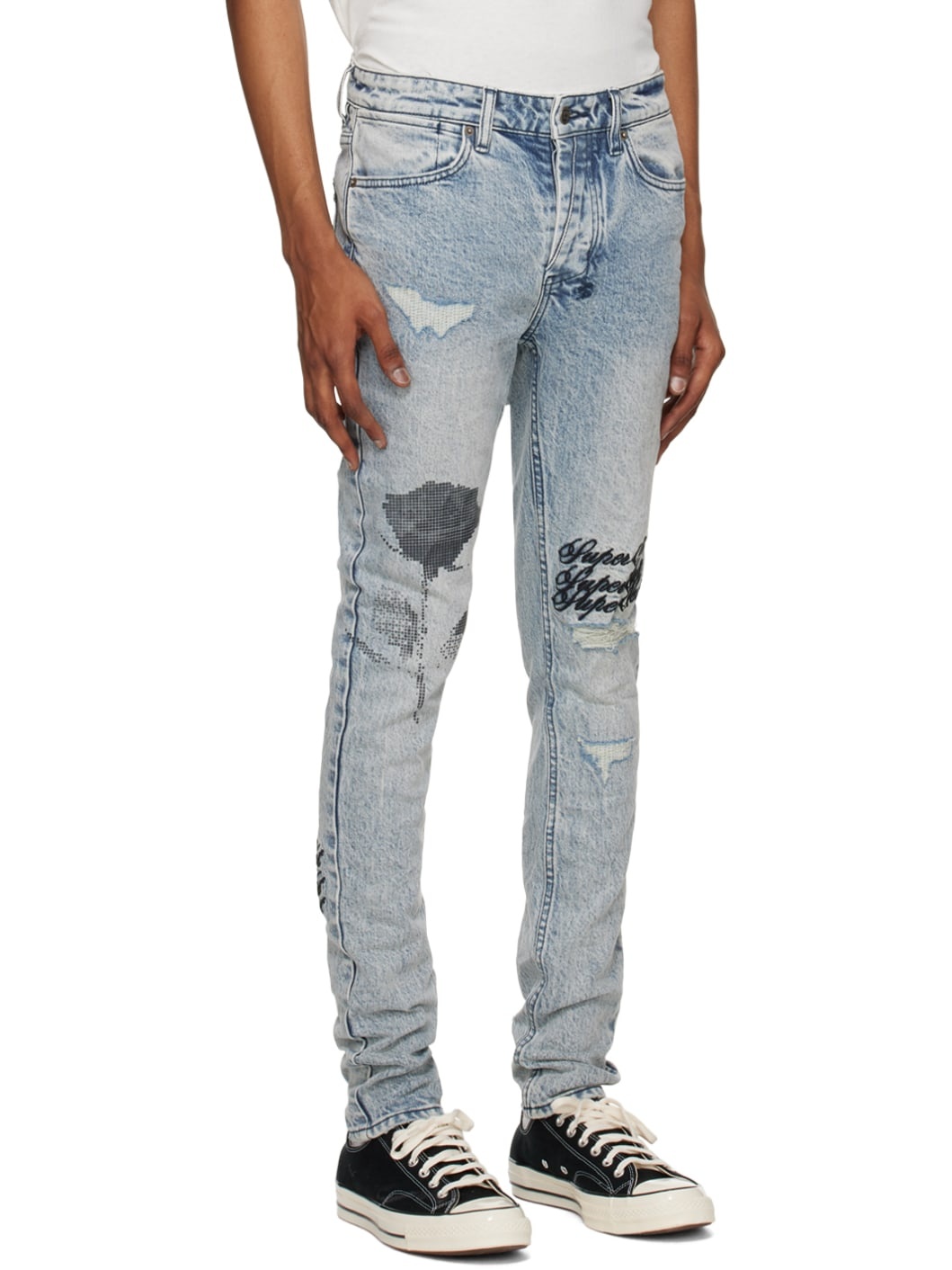 Skinny-fit stretch denim jeans. Fading and distressing throughout. · Belt loops · Five-pocket styling · Button-fly · Graphic printed at front · Text embroidered at front and back · Logo graphic embroidered at back · Logo engraved silver-tone hardware Supplier color: Denim