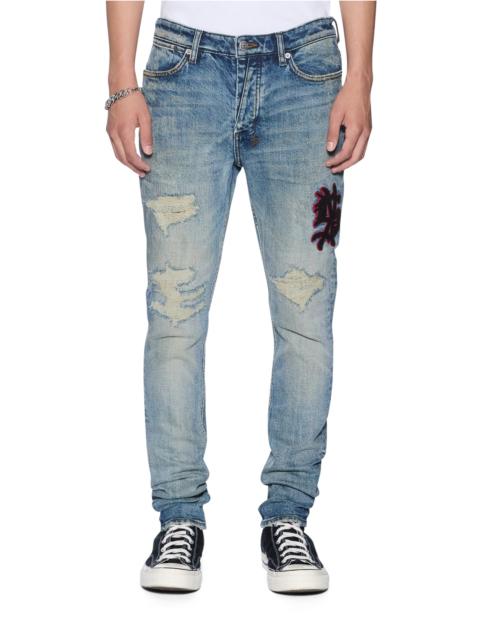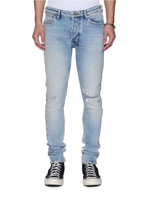 The Bronko Backstage Black Studded is a mid-rise, full-length jean with a boot-cut leg. Made from stretch black denim with a wax wash and flock-coated finish, it features a flocked contrast fabric side seam panel with a plus-stud pattern running down the leg and a black leather backed metal plate at the coin pocket. Finished with hot-fixed diamante t-box and 4x4, ghost patching detailing and Ksubi branded hardware. FEATURES, SIZE & FIT - Flared wide leg denim jean - Regular fit - Mid rise - Button fly closure - 5 pockets - Fixed waistband - Ksubi T-box - Back 4x4 cross embroidery - Signature woven pocket tag - Branded hardware - Little/some stretch - 100% cotton - Size 32 inseam: 86cm / 33 7/8" - Size 32 front rise: 27cm / 10 5/8" - Model is wearing a size 30/M, height 181cm / 6'0", chest 84cm, waist 68cm, hip 94cm - Care: Cool machine wash with like colours, wash inside out, do not bleach, remove promptly after wash, do not tumble dry, cool iron on reverse, do not iron directly onto prints or metal hardware, colour may transfer onto other garments and upholstery