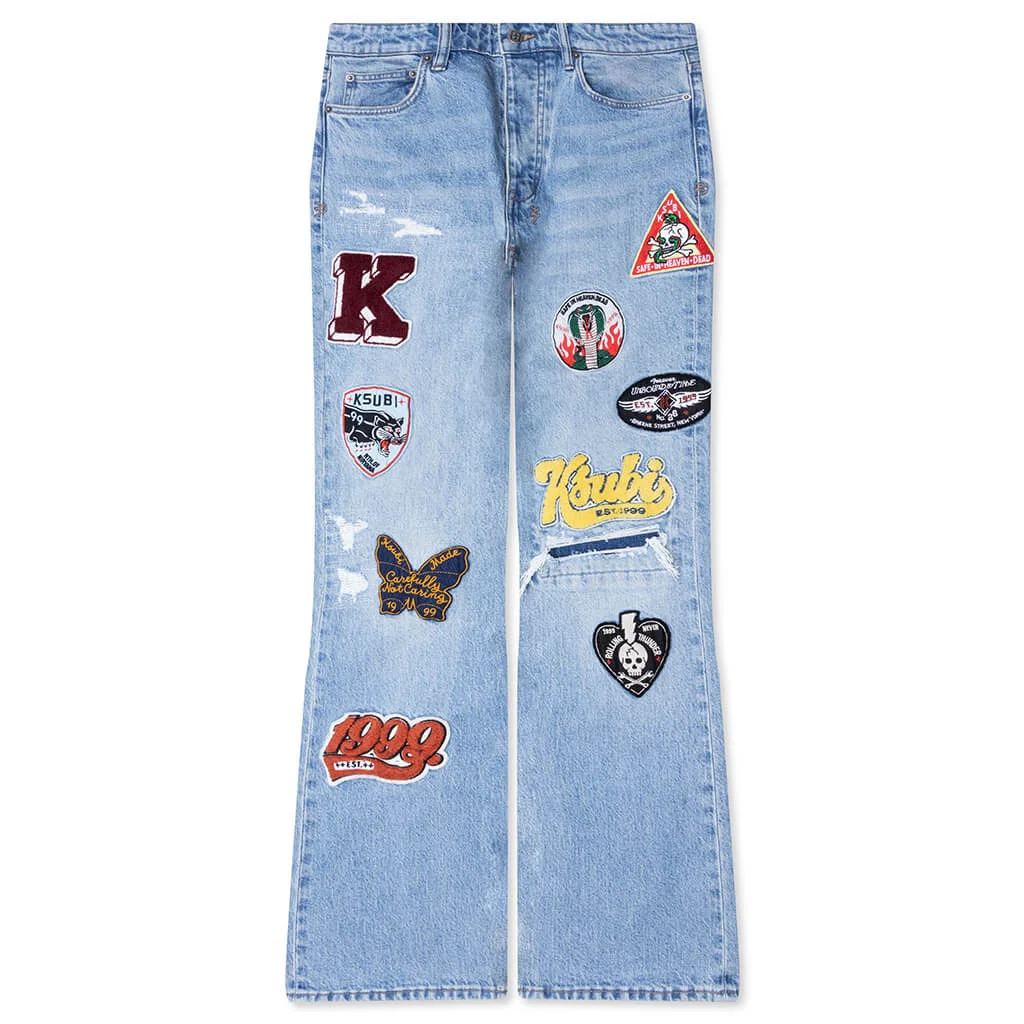 The Ksubi Bronko in True Patched offers a mid-rise, full-length silhouette with a subtle boot-cut leg. Crafted from premium denim, the style undergoes an overdye and stone wash treatment with rip-and-repair deconstruction for a distressed, vintage character. Embroidered patches are placed throughout, adding depth and texture to the design. Signature Ksubi 4x4 branding appears on the back, complemented by the removable woven pocket label reading “Royalty, Heroism and The Streets.” - 100% Cotton - Premium denim - Boot leg - Mid rise - Overdye and stone wash - Rip and repair construction - Embroidered patches all over - Style No: MFA25DJ005