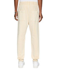 The Resort Trax Desert is a slim fit track pant with ribbed cuff in a cream colourway. Garment dyed and made from a premium reversed cotton loopback fleece with aged wash. This style features front cross dollar embroidery, front welt pockets with metal zip and branded puller, drawstring with branded metal trims, back patch pockets, back 4x4 cross embroidery and Ksubi t-box branding. FEATURES, SIZE & FIT - Track pant - Slim fit - Cream colourway - 100% premium cotton - Original Ksubi 4x4 cross print - Branded hardwear - Model is6'2"and wears a size medium