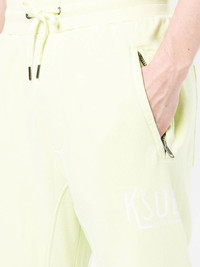 drawstring-waist cotton track trousers drawstring-waist cotton track trousers from KSUBI featuring light green, cotton, jersey fleece, logo print to the front, drawstring fastening waist, slim cut, two side zip-fastening pockets, two rear patch pockets and elasticated ankles. Imported Composition Body: Cotton 100% SIZE & FIT Model measurements Height 6 ft 2 in(1.88 m) Bust/Chest 36.61 in(93 cm) Hips 38.58 in(98 cm) Waist 31.1 in(79 cm) FittingInformation This piece fits true to size. We recommend you get your regular size Designed to be loose over the leg with a fitted waist and hem Made with a mid-weight fabric Washing instructions Machine Wash