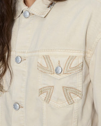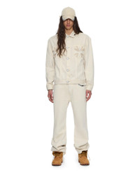 The Oh G Jacket Ivory is an oversized-fit trucker jacket crafted from premium rigid denim in a clean ivory wash. Built with traditional denim trucker construction, it is detailed with intricately laser-cut leather appliques in bold graphic shapes around the pocket edges, secured with thick-gauge saddle stitching. Finished with T-box and 4x4 embroidery branding and Ksubi by Alice Hollywood hardware, this style fuses classic workwear with statement artistry. FEATURES, SIZE & FIT - Oversized fit jacket - Button closure - Regular collar - 4x4 cross embroidery - Ksubi t-boxed branding - Ksubi x alice pocket tag - No stretch - Size m shoulder to hem length: 67cm / 26 3/8" - Cool machine wash with like colours, wash inside out, do not bleach, remove promptly after wash, do not tumble dry, cool iron on reverse, do not iron directly onto prints or metal hardware, colour may transfer onto other garments and upholstery - MAH25JK002