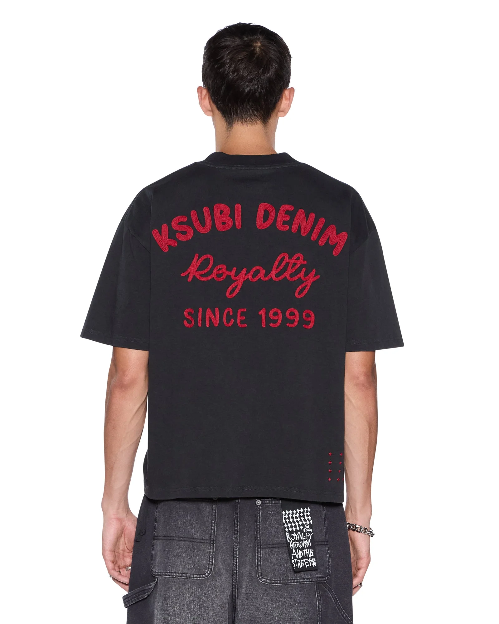 The Mekanik Halen SS Tee Charcoal/Red, is a short-sleeve t-shirt with dropped shoulders and a raw-cut back hem. It features reversed overlocked side seams, Ksubi's signature rats tail, and branded logos. Crafted from premium cotton jersey in washed black, it showcases seasonal chainstitched artwork on both the front and back. Finished with signature T-box and 4x4 embroidery branding.