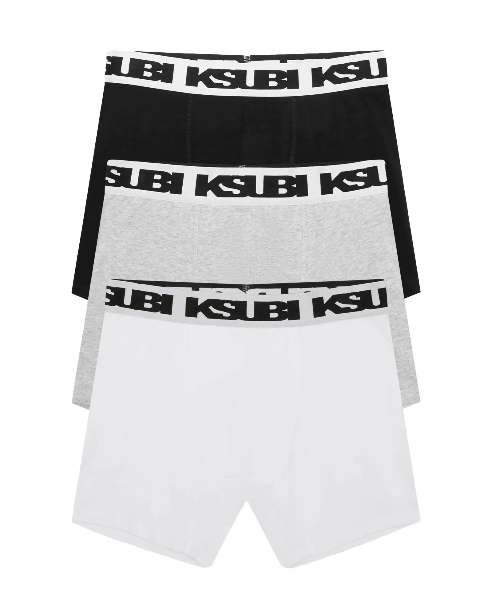 The Royalty Boxer Brief 3 Pack Multi is a set of 3 regular fit boxer shorts made from a premium stretch cotton. This pack comes with 1x White 1x Black and 1x Grey boxer briefs. The shorts feature a custom elastic waistband branded with the Ksubi logo and signature printed details. FEATURES, SIZE & FIT - 3 pack boxer briefs - Elastic waistband - Ksubi t-box print - Back cross print - Mid-rise waist - Men's size M equivalent to female's size 8-10: (refer to full size guide in images) - Size M - waist 70cm/hip 81cm/leg length 26cm - 95% cotton, 5% elastane - High stretch - Cool machine wash with like colours, wash inside out, do not bleach, remove promptly after wash, do not wring, do not tumble dry, cool iron on reverse, do not iron directly onto prints or metal hardware, do not dry clean. - UPS24UW001