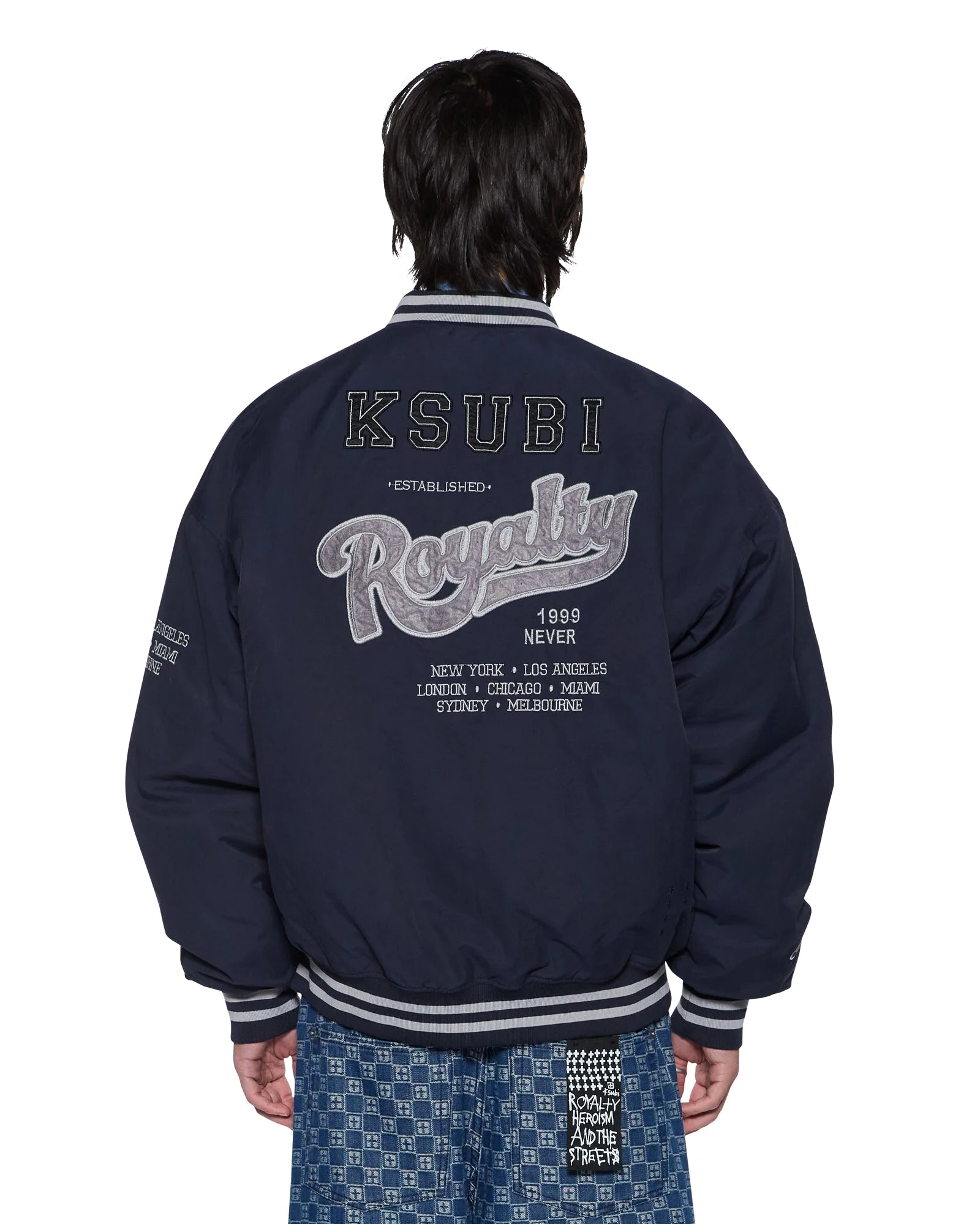 The Royalty Ma-1 Bomber Navy is an oversized padded bomber jacket crafted from premium navy nylon with welt snap pockets, internal pocket, and center front zip closure. It features oversized royalty applique patches and embroidery on the chest, sleeves, and back, finished with tonal T-box and 4x4 embroidery branding. FEATURES, SIZE & FIT - Oversized fit jacket - Classic bomber length with zip closure - Regular collar - Ksubi T-box embroidery and back 4x4 cross embroidery - Signature woven sleeve tag and branded hardware - No stretch - Shell: 60% cotton, 40% polyamide; Lining: 100% polyester - Size M length: 71cm / 28", chest circumference: 149cm / 58.75", hem circumference: 99cm / 39" - Model is wearing a size 30/M, height 181cm/6'0", chest 84cm, waist 68cm, hip 94cm - Cool machine wash with like colours, do not bleach, do not wring, do not tumble dry, dry flat without delay, cool iron on reverse, do not dry clean - Product code: MFA25JK012