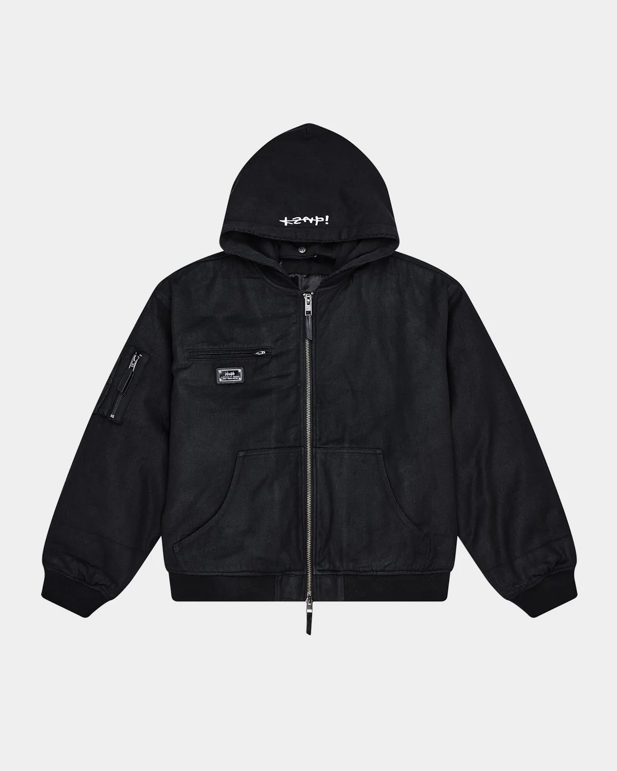 Finished with the brand's nameplate, this Ksubi jacket is crafted from a waxed denim that creates a modern look. Hooded neckline with printed logo Long sleeves Zip pockets on the chest and sleeve Exposed twoway zipper Split kangaroo pocket Banded cuffs and hem Cotton Hand wash Imported