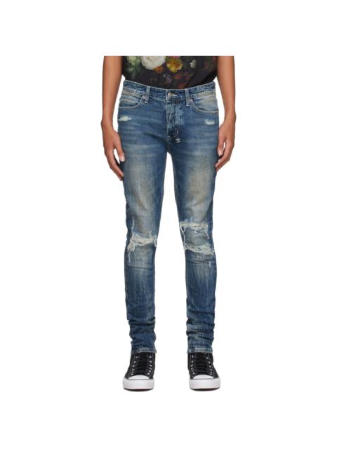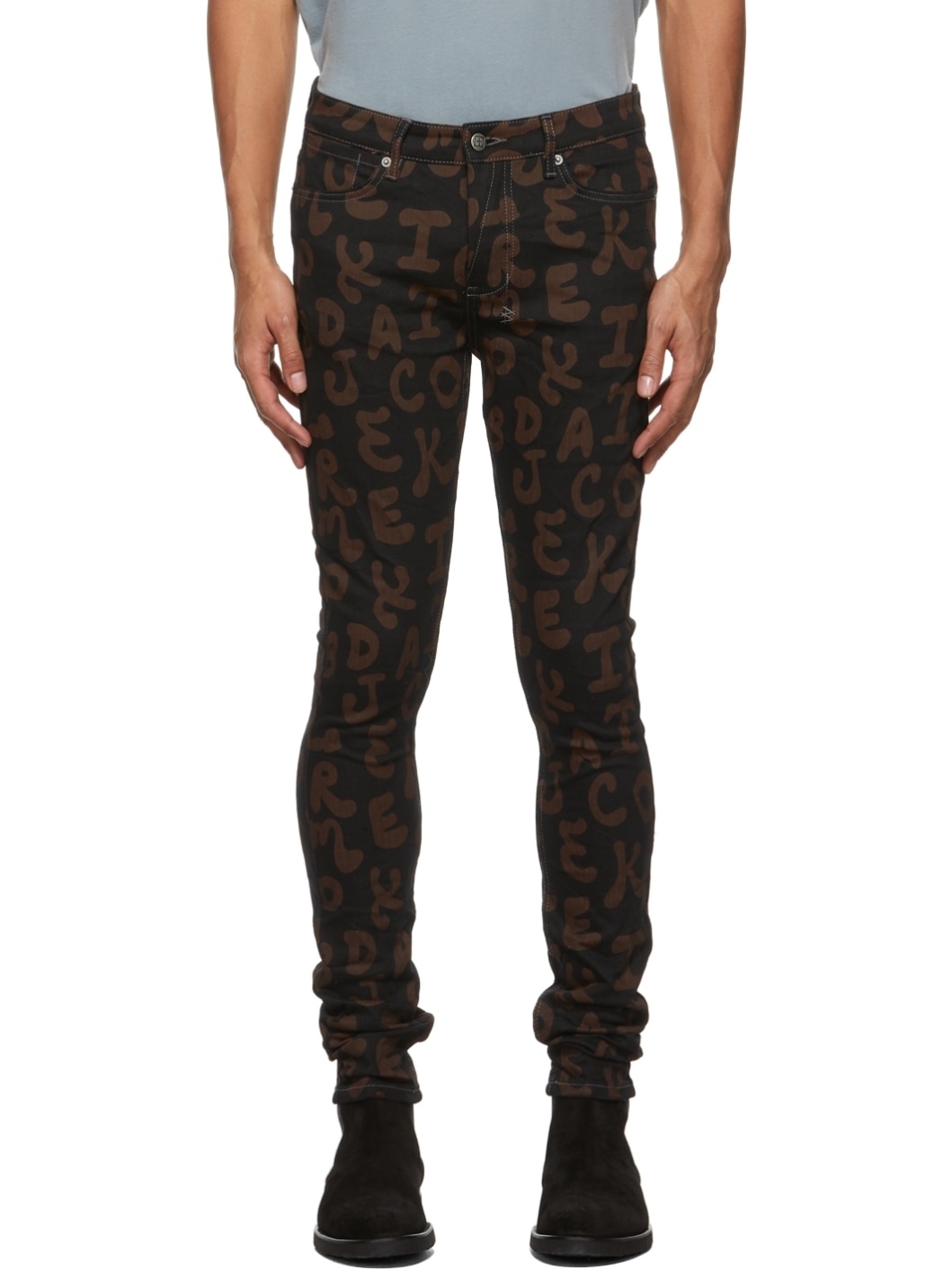 Skinny-fit stretch denim jeans in black featuring text printed in brown throughout. Supplier color: Jet black 98% cotton, 2% elastane.