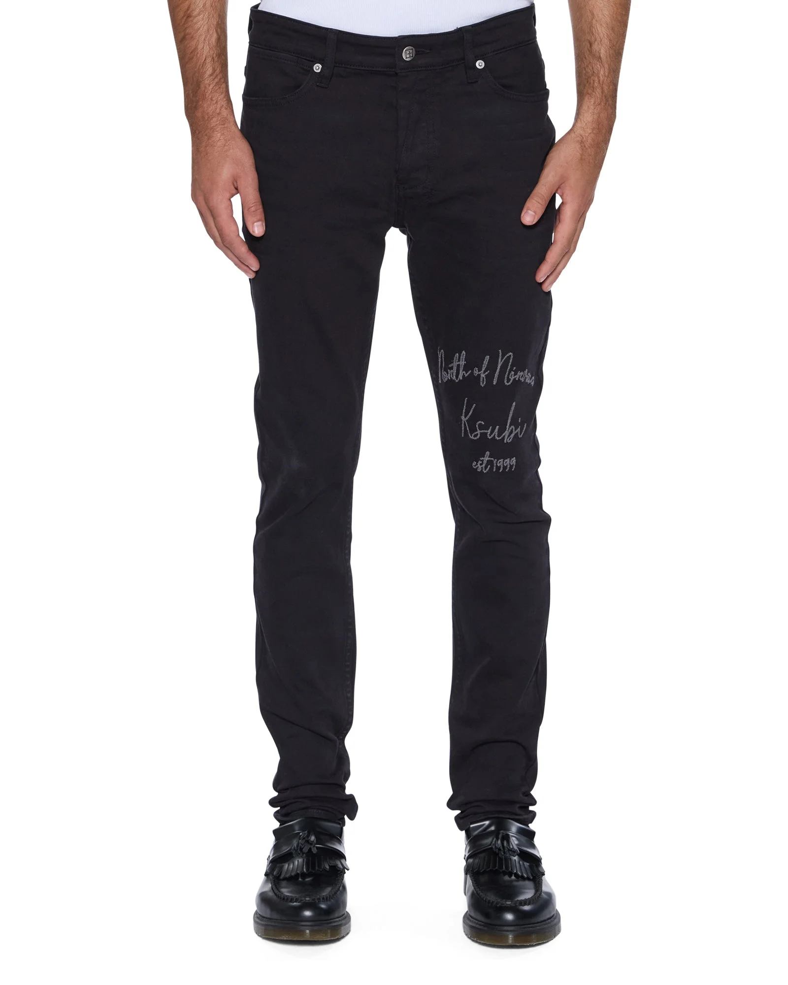 The Van Winkle Jasper Black Arch is a mid-rise, five-pocket full-length skinny jean made from premium comfort stretch denim in a black wash. Featuring unique angled belt loops, front fly seam detail, and script detailing on the left thigh, it's finished with t-box and 4x4 embroidery, and Ksubi branded hardware. FEATURES, SIZE & FIT - Skinny leg denim jean - Full length - Mid rise - Button fly closure - 5 pockets - Fixed waistband - Ksubi t-box - Back 4x4 cross embroidery - Signature woven pocket tag - Branded hardware - Some/plenty of stretch - 98% cotton 2% elastane - Size 32 inseam: 84cm / 33" - Size 32 front rise: 26cm / 10 1/8" - Model is wearing a size 32/M, height 184cm / 6'0", chest 86cm, waist 70cm, hip 94cm - Cool machine wash with like colours - Wash inside out - Do not bleach - Remove promptly after wash - Do not tumble dry - Cool iron on reverse - Do not iron directly onto prints or metal hardware - Colour may transfer onto other garments and upholstery - MPF25DJ004