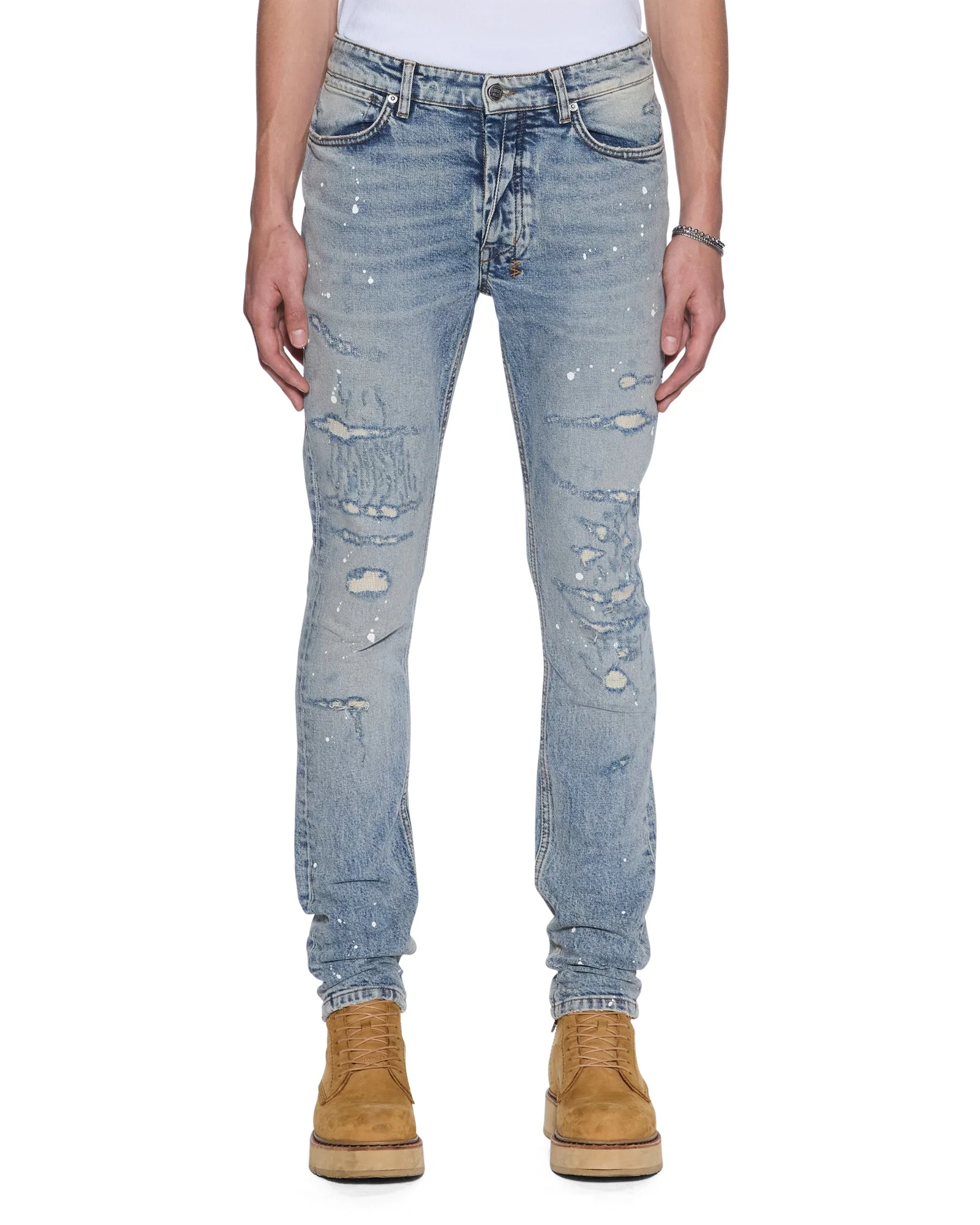 The Van Winkle Paint Summer Blue is a mid-rise, full-length skinny jean with a five-pocket design. Made from European comfort stretch denim with a heavily faded indigo, stonewashed look, it features strong seam ageing, heavy repaired deconstructions with traditional repair topstitching, and paint splatters, finished with contrast T-box and 4x4 embroidery, ghost patch detailing, and Ksubi hardware. FEATURES, SIZE & FIT - Slim fit short - Mid to long rise - Button closure - 5 pocket jean with fixed waistband - Raw cut hem - Ksubi t-boxes and back 4x4 cross embroidery - Signature woven pocket tag and branded hardware - Little/some stretch, 99% cotton 1% elastane - Size 32 inseam: 20cm / 8", front rise: 28.5cm / 11 1/4" - Model is wearing a size 30/M, height 181cm/6'0", chest 84cm, waist 68cm, hip 94cm - Care: Machine wash cold with like colours, do not tumble dry, do not bleach, cool iron if necessary - Prod