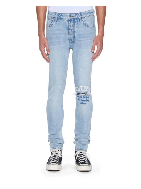 The Van Winkle Rogue Blue Graffiti is a mid-rise, full-length skinny jean with a five-pocket design. Made from European indigo comfort stretch denim with a heavy stonewash and authentic ageing treatments, it features strong seam ageing in natural wear areas, seasonally printed graffiti artwork throughout, ghost patch detailing, and finished with contrast T-box and 4x4 embroidery an FEATURES, SIZE & FIT - Skinny leg denim jean - Full length - Mid rise - Button fly closure - 5 pockets - Fixed waistband - Ksubi t-box - Back 4x4 cross embroidery - Signature woven pocket tag - Branded hardware - Some/plenty of stretch - 98% cotton, 2% elastane - Size 32 inseam: 84cm / 33" - Size 32 front rise: 26cm / 10 1/8" - Model is wearing a size 30/M, height 181cm / 6'0", chest 84cm, waist 68cm, hip 94cm - Cool machine wash with like colours, do not tumble dry, do not bleach, cool iron on reverse - Product code MPS26DJ101