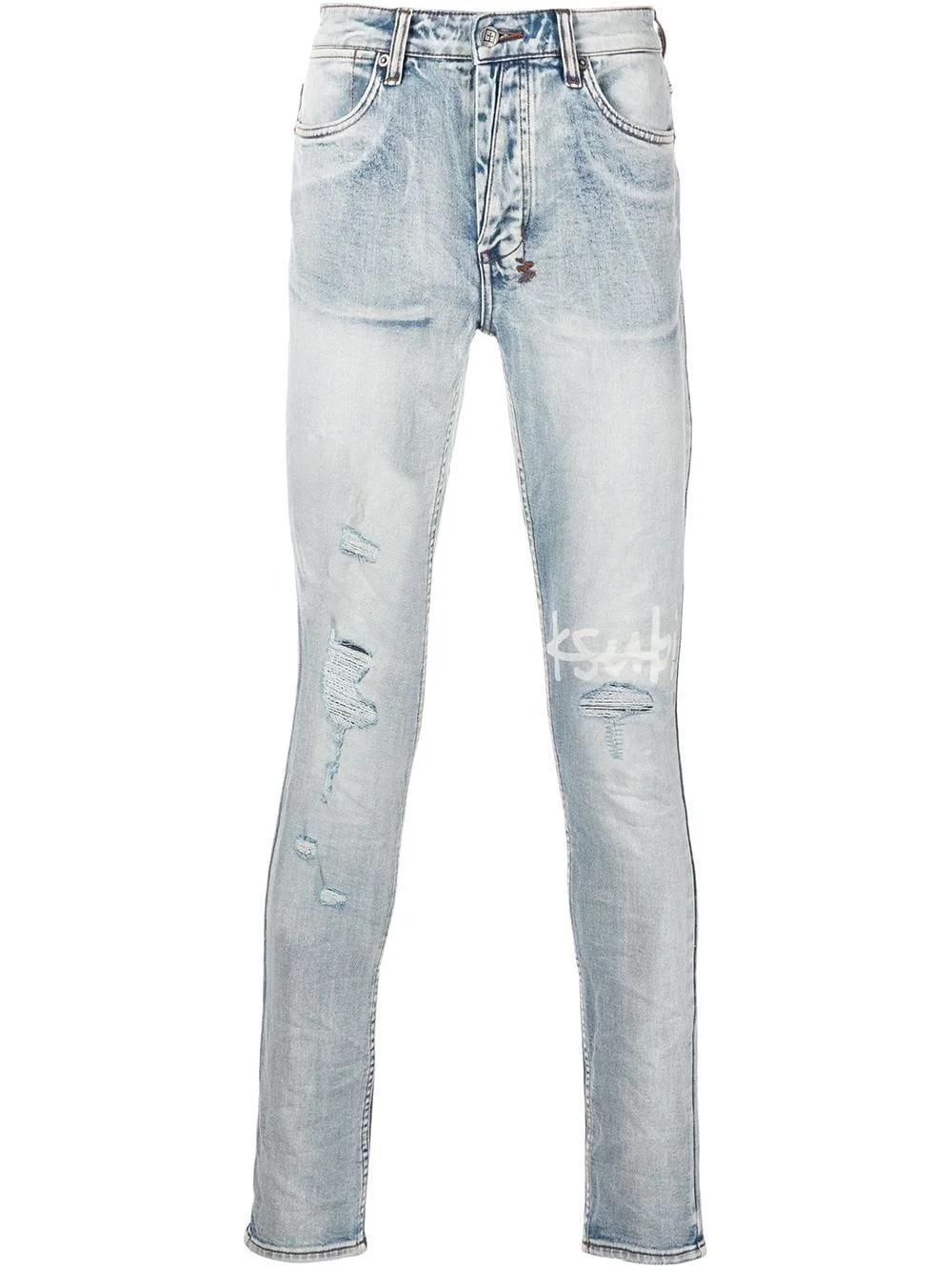 Van Winkle skinny jeans 1999 city high blue cotton-denim stonewashed distressed finish slogan print to the front high waist button fly fastening belt loops classic five pockets skinny cut Imported Composition Cotton 100% SIZE & FIT Model measurements Height 6 ft 1 in(1.85 m) Bust/Chest 39.76 in(101 cm) Hips 36.61 in(93 cm) Waist 27.95 in(71 cm) FittingInformation This piece fits true to size. We recommend you get your regular size Cut for a slim fit Made with a mid-weight fabric Measurement FRONT RISE 9.01 in(22.9 cm) INSIDE LEG 32 in(81.3 cm) BACK RISE 10.98 in(27.9 cm) HIPS 30.98 in(78.7 cm) Hem Width 10.98 in(27.9 cm) WAIST 27 in(68.6 cm)