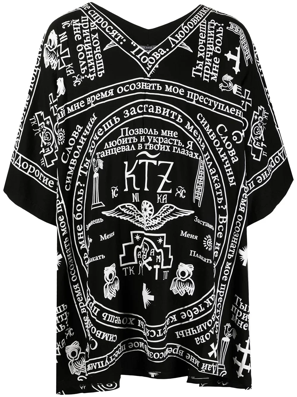 church print kaftan shirt black/white cotton all-over graphic print V-neck short sleeves handkerchief hem When buying this unisex item, keep in mind that it is graded in standard men's sizing. Imported Composition Back: Cotton 100% SIZE & FIT Model measurements Height 5 ft 10 in(1.79 m) Bust/Chest 32.28 in(82 cm) Hips 35.43 in(90 cm) Waist 24.01 in(61 cm) FittingInformation This piece is unisex. Please take care when selecting your size Cut for an oversized fit for both men and women Made with a mid-weight fabric Washing instructions Machine Wash