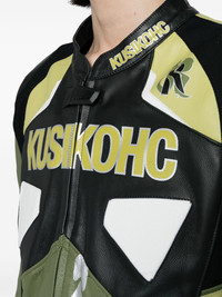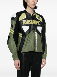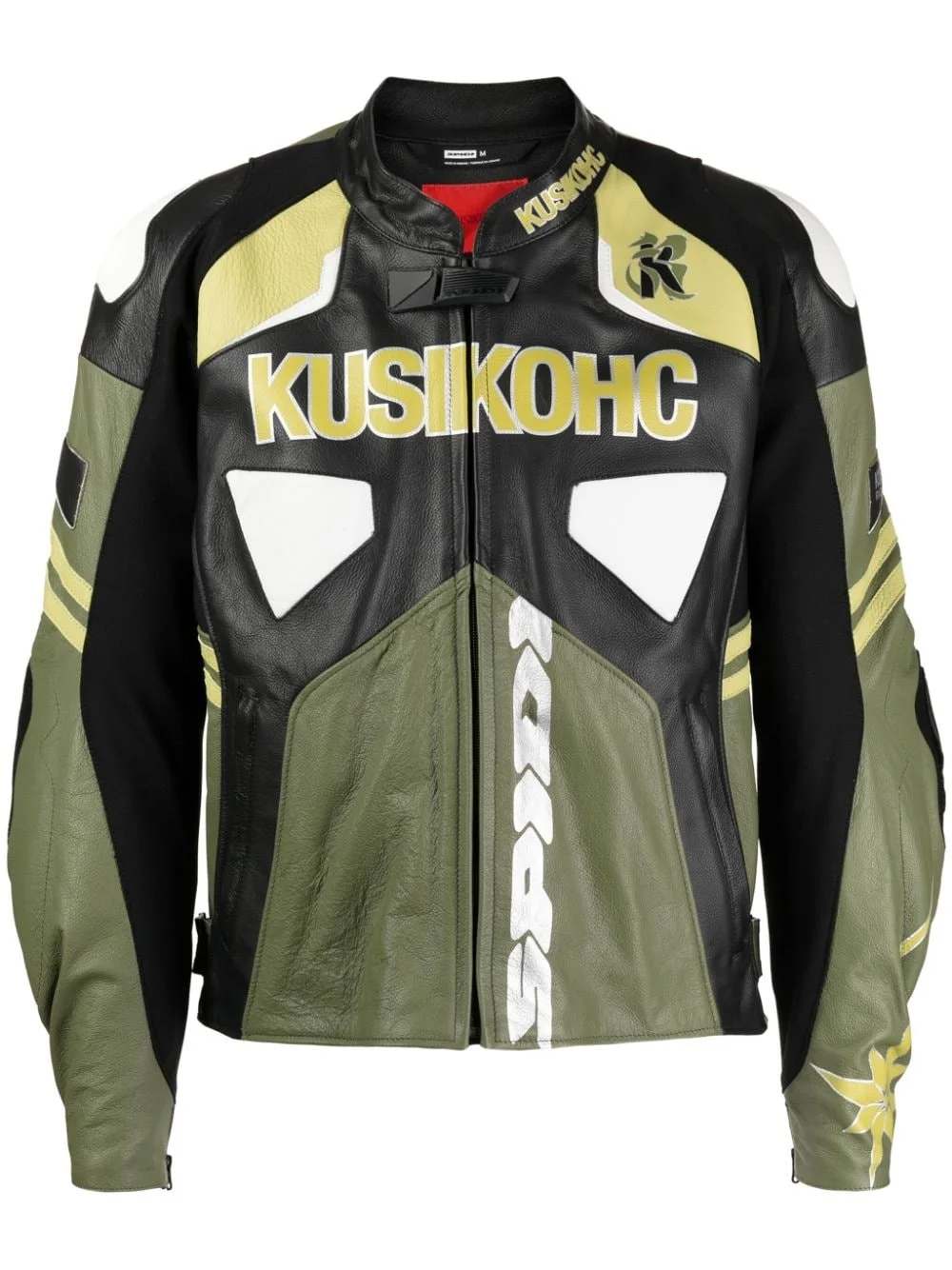 Spidi logo-print leather jacket Highlights - Black/dark green - Leather - Grained texture - Panelled design - Logo print to the front - Graphic print to the rear - Slogan print to the rear - Front zip fastening - Long sleeves - Straight hem - Two zip-fastening pockets - Straight hem Made in Italy Composition Body: Leather 90%, Polyamide 7%, Polyurethane 3% SIZE & FIT Model measurements Height 6 ft 2 in(1.87 m) Bust/Chest 33.07 in(84 cm) Hips 35.43 in(90 cm) Waist 26.77 in(68 cm) FittingInformation Designed for a boxy fit, intended for a loose fit throughout The adjustable tabs allow for fitted preferences Firm leather offering little flexibility to maintain its durability and sturdiness This piece fits true to size – take your usual size Washing instructions Do Not Wash/Do Not Dry Clean