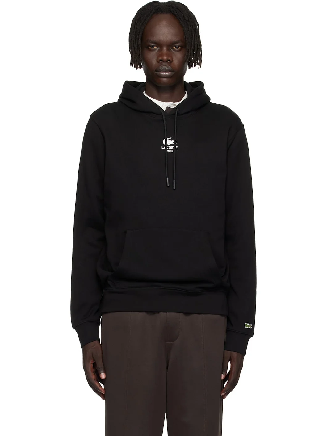 Cotton French terry hoodie. · Drawstring at hood · Logo printed at chest and back · Kangaroo pocket at waist · Rib-knit hem and cuffs · Embroidered logo patch at cuff Supplier color: Black Body: 100% cotton. Trim 1: 97% cotton, 3% elastane. Trim 2: 100% cotton. Made in Viet Nam 252268M202003