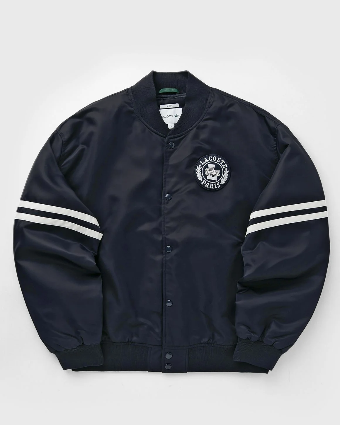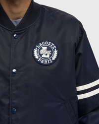 This bomber jacket is a new take on the classic silhouette in 100% Lacoste style. The jacket is full of classic accents and iconic details, such as a badge and contrast stripes, with technical details including special padding and a water-repellent treatment. - Nylon with water-repellent treatment - Recycled polyester lining - Ribbed neck, waistband and cuffs - Contrast stripes on sleeves - Embroidered badge on chest Article Number: BH3441-HDE Gender: Men Color: ABYSM Material: 100% Polyester
