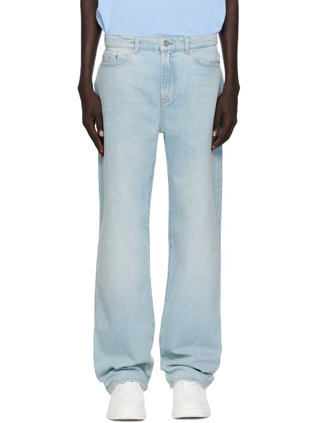 Non-stretch organic cotton denim jeans. · Fading and whiskering throughout · Straight-leg · Belt loops · Five-pocket styling · Zip fly · Logo patch at back waistband · Contrast stitching in tan Supplier color: Washed bleach 100% organic cotton. Made in Tunisia 252268M186000