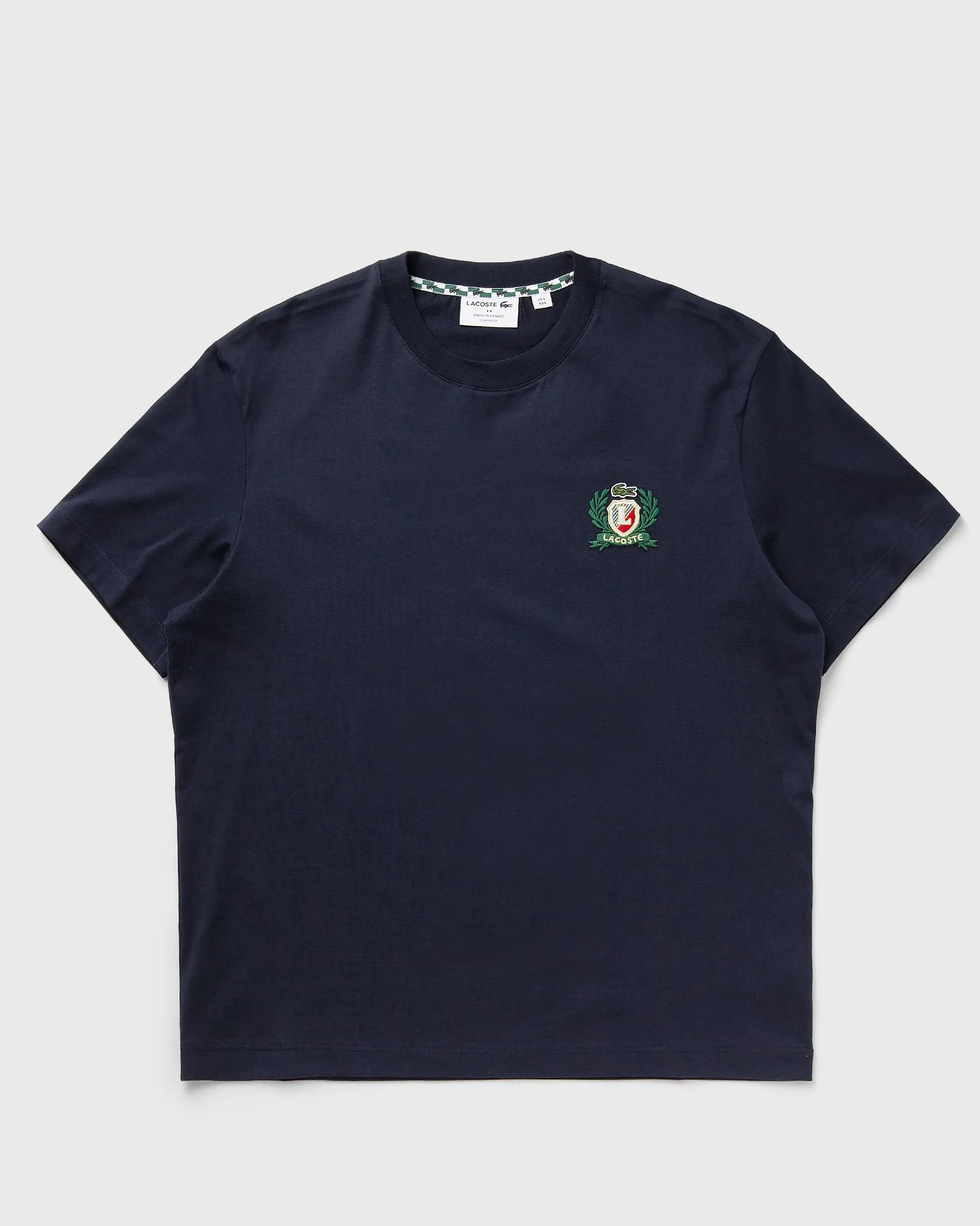 This Lacoste T-shirt is made in France from lightweight cotton jersey with signature details such as a traditional badge and embroidered crocodile. - Organic cotton jersey - Classic fit for natural comfort - With embroidered, traditional badge on the chest - Sewn-on, embroidered crocodile on the chest Article number: TH0027-166 Gender: men Color: Navy Blue Material: 100% Cotton