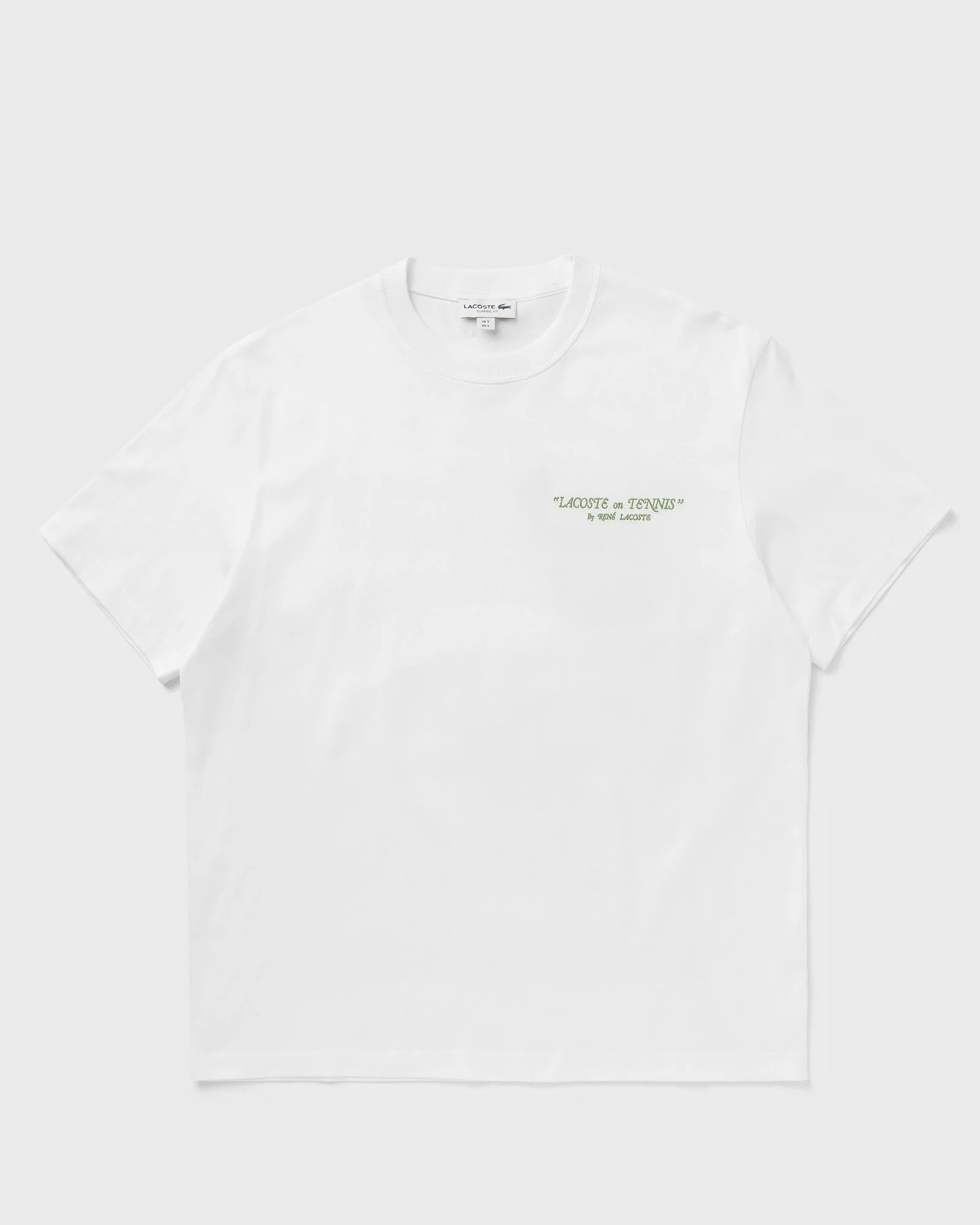 This T-shirt from Lacoste, the sportswear pioneer since 1933, combines modern style with high-quality details. Made from thick, soft jersey, it features subtle embroidery on the front and a striking contrasting print on the back. - Heavyweight organic cotton jersey - Classic fit with comfortable cut and sleeves - Embroidery on the front, print on the back - Embroidered crocodile under the neck Article number: TH1425-001 Gender: men Color: white Material: 100% Cotton