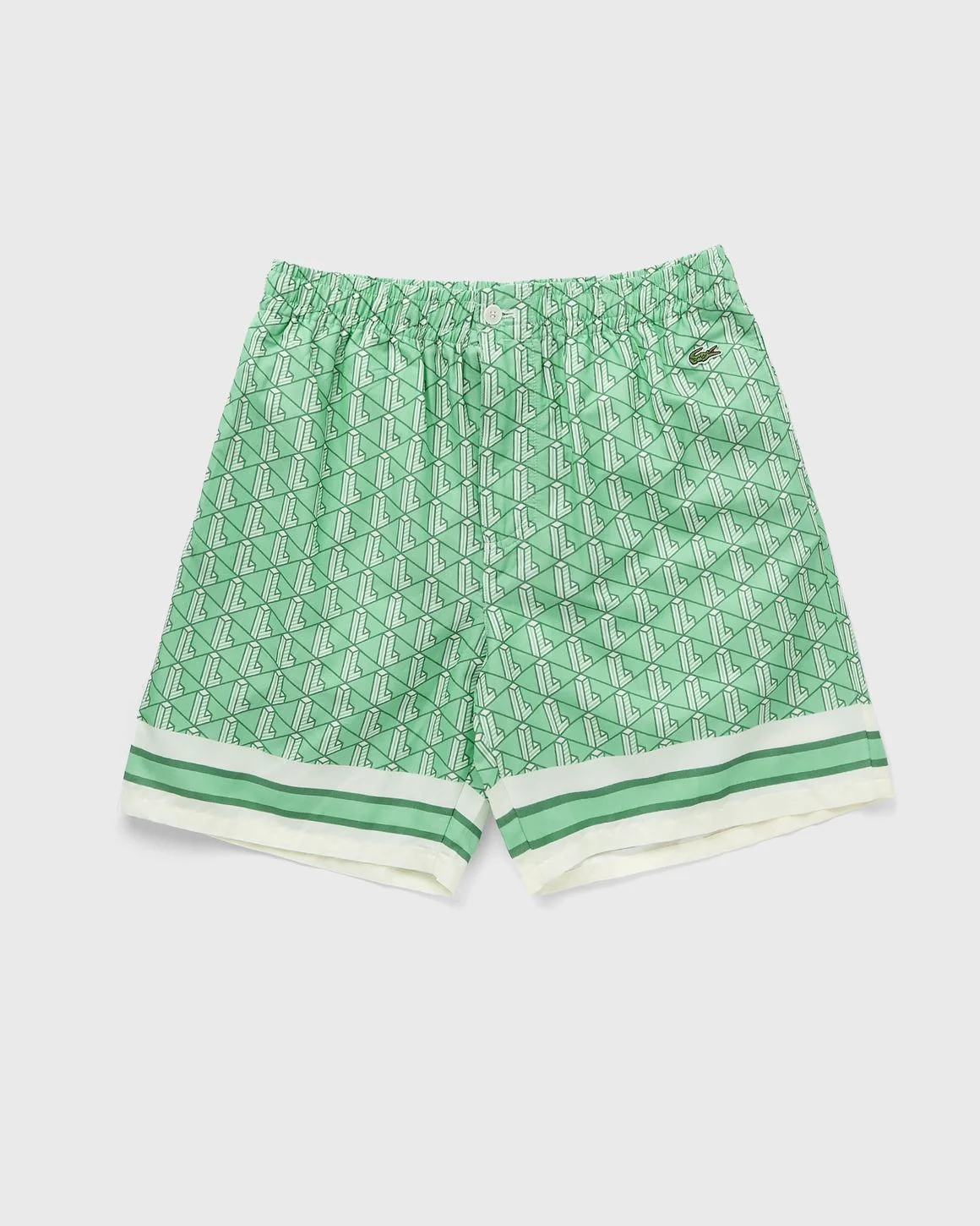 These shorts with signature details from Lacoste are made from twill cotton blend fabric with an iconic all-over monogram print for a distinctive style. Contrast stripes and an embroidered crocodile create a casual look. - Organic cotton blend viscose and twill - Relaxed fit - Elastic waistband with drawstring - All-over monogram print, contrast stripes on leg - Embroidered crocodile on waistband Article Number: GH9928-GIQ Gender: Men Color: LIAMONE/SPRUCE-CRYSTAL Material: 100% Cotton