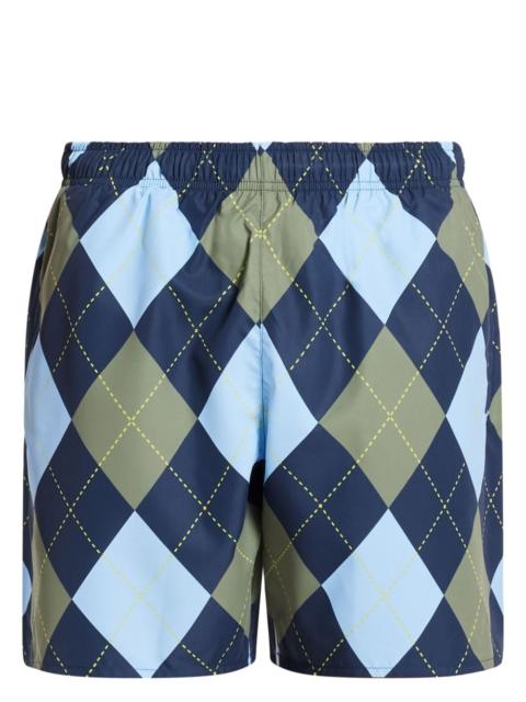 geometric-print swim shorts Highlights - Blue/white - Recycled polyester - Geometric print - Elasticated waistband - Two side slit pockets - Rear welt pocket - Embroidered logo to the rear - Be mindful to try on swimwear over your own garments. Imported Composition Recycled Polyester 100%