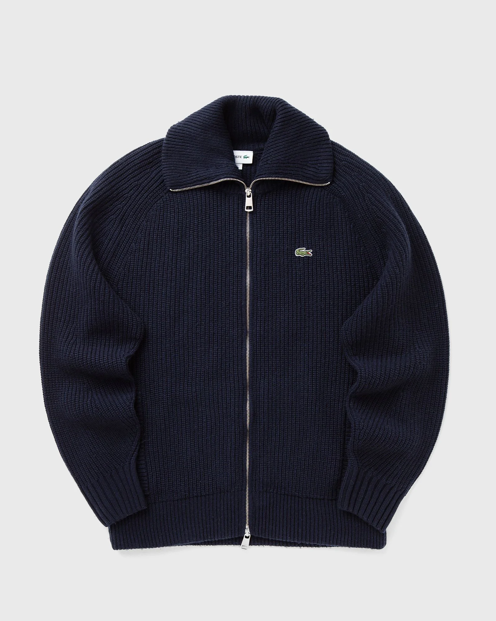 This high-neck sweater combines 90 years of Lacoste knitting expertise and elegance. Made from soft, warm wool with a fine pearl rib knit and subtly shaded sleeves, it offers both comfort and style. The timeless design is rounded off by the embroidered signature crocodile and ergonomic details such as the two-way zipper. - Checkered rib knit made from animal-friendly wool - Wide 5-gauge knit - Center zipper with two sliders - Two side pockets - Embroidered crocodile on the chest Article number: AH5175-166 Gender: men Color: Navy Blue Material: 100% Wool