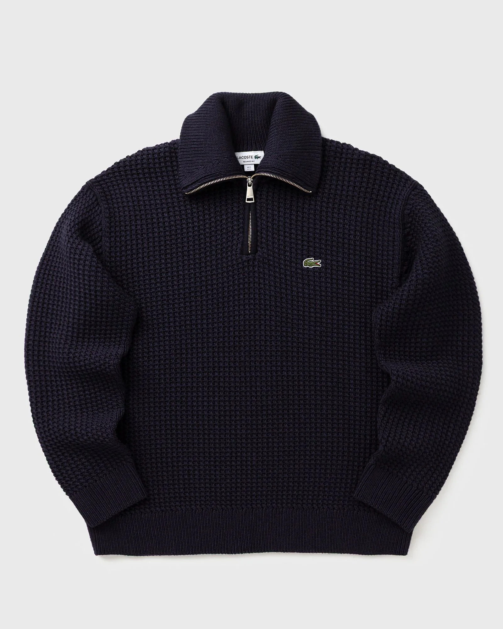This sweater embodies casual elegance and Lacoste's many years of knitwear expertise. Made from high-quality wool with a loose fit for maximum comfort, it features a high collar, zipper, and fine crochet details. The timeless design is rounded off by the green embroidered signature crocodile. - Wool blend from animal-friendly sources - Relaxed fit with dropped shoulders - Wide 5-gauge knit - High collar with zipper - Sewn-on embroidered crocodile on the chest Article number: AH5205-166 Gender: men Color: Navy Blue Material: 46% Acrylic, 6% Polyester, 48% Wool