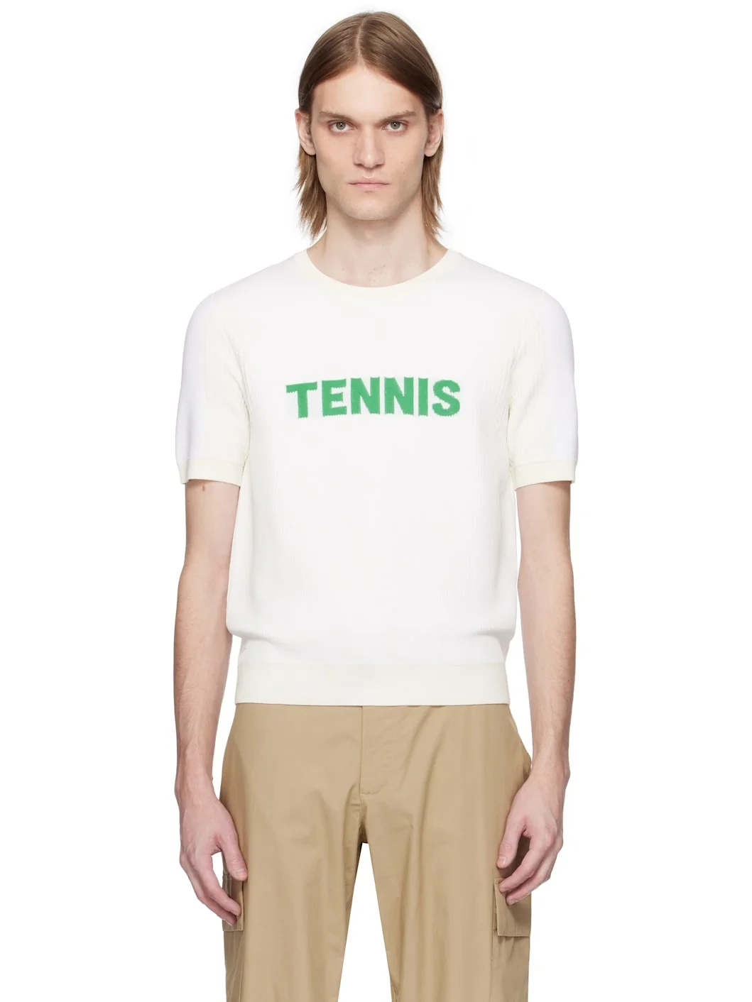 Rib-knit rayon- and nylon-blend T-shirt. · Crewneck · Jacquard text at chest · Logo patch at front hem Supplier color: White/Green Body: 76% rayon, 18% polyamide, 6% polyester. Trim 1: 46% rayon, 32% polyamide, 18% polyurethane, 4% polyester. Trim 2: 93% rayon, 7% polyester. Made in Italy 251268M213028