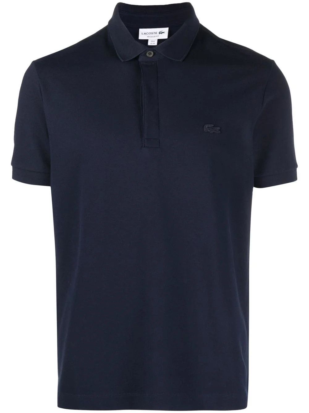 logo-patch polo shirt Lacoste presents their logo patch in a tonal hue on this navy polo shirt. This creates an understated take on branding for the stretch-cotton piece. Imported Composition Cotton 94%, Elastane 6% Washing instructions Machine Wash