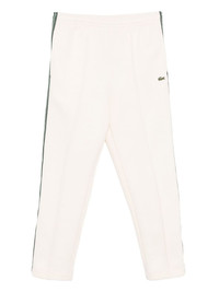 The Lacoste training trousers impress with a slim fit and high-quality organic cotton fleece for a comfortable fit. The elasticated waistband and ribbed cuffs create a modern, sporty silhouette. Practical pockets offer plenty of space for everyday wear and training. The embroidered signature crocodile logo rounds off the minimalist design. - Double-sided jersey made from organic cotton - Regular fit, straight cut - Structured, contrasting striped bands on the legs - Sewn pleats on the front - Two side pockets - Embroidered crocodile on the left leg Article Number: XH5824-XFJ Gender: Men Color: LAPLAND Material: 90% Cotton, 10% Polyester
