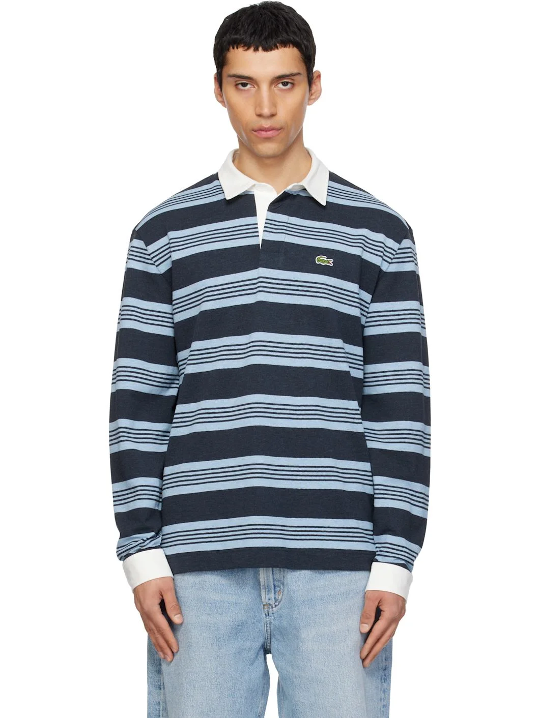 Cotton pique polo. · Stripes throughout · Twill spread collar and barrel cuffs · Concealed three-button placket · Embroidered logo patch at chest · Vented side seams Supplier color: Bleu chine/Gris chine 100% cotton. Made in Viet Nam 261268M212010
