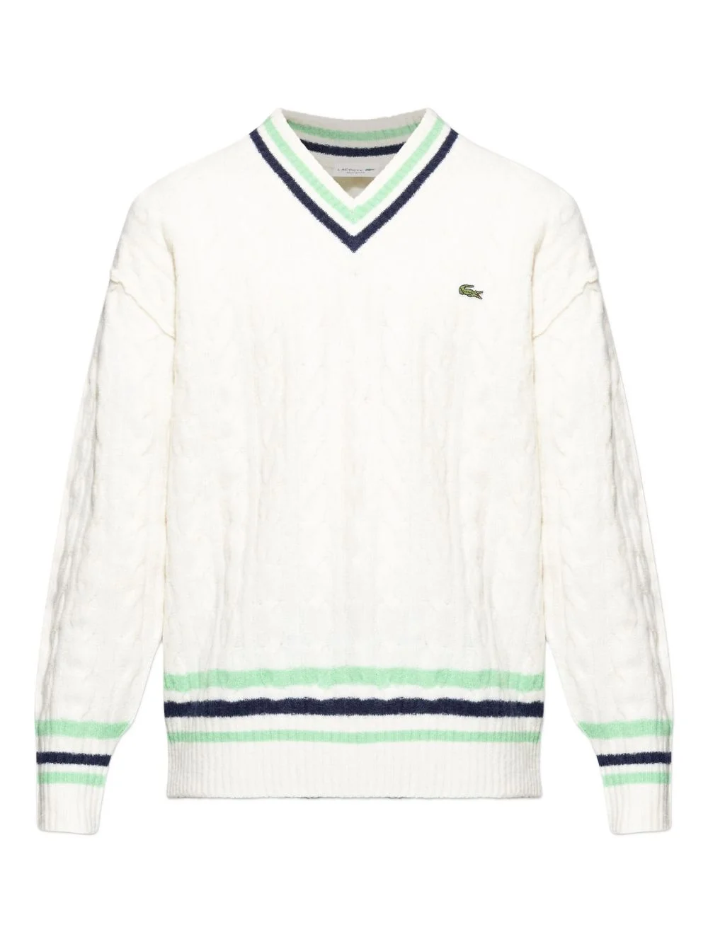 V-neck cable-knit jumper Highlights - White - Wool knit - Front logo patch - V-neck - Long sleeves - Striped cuffs Imported Composition Wool 100% Washing instructions Read Manufacturer Guidelines
