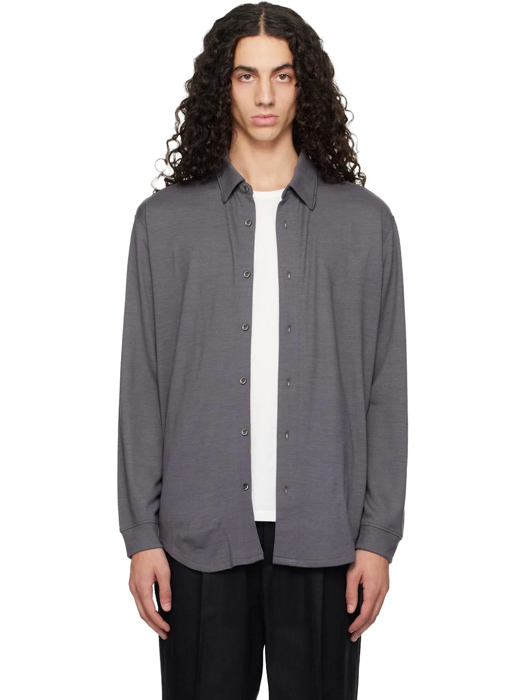 Wool jersey shirt. · Pre-shrunk · Spread collar · Button closure · Shirttail hem · Dropped shoulders · Rib-knit cuffs · Box pleat at back yoke Supplier color: Slate grey 100% wool. Made in United States 252840M192001