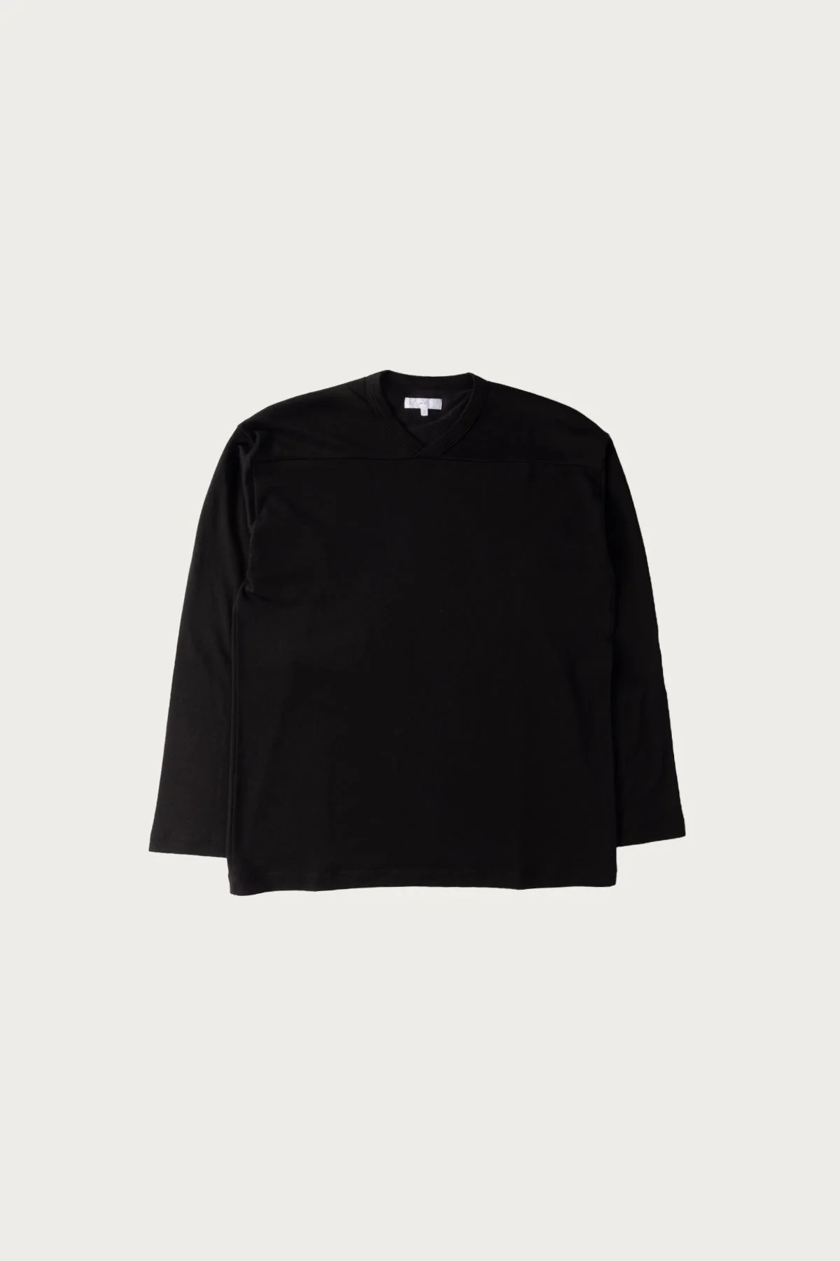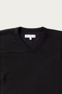 Crafted from 100% California cotton, this long-sleeve football t-shirt features a micro pique texture, a two-button placket, and a relaxed boxy silhouette for a refined yet comfortable fit. Fits true to size. - 100% California - Micro Pique - Two Button Placket - Boxy Silhouette - Made in Los Angeles - Black