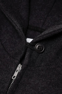 The Wool Zip Hoodie is a wide, boxy-fitting hooded jacket with a shorter body. Cut from a 100% wool knit in Japan, the heavyweight fabric has a light and straight drape. The 2-piece sleeve curves along the natural posture of the arm. - Wide boxy fit - Patch pockets - Concealed button loop neck closure - 9-ounce 100% wool (Japan) - Cut and sewn in Los Angeles, CA - Charcoal