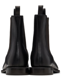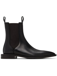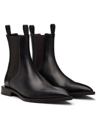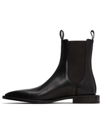 Ankle-high buffed calfskin Chelsea boots. · Pointed toe · Pull-loops at collar · Elasticized gusset at sides · Stacked leather heel with rubber injection · Leather sole Supplier color: Black Upper: calfskin. Sole: leather, rubber. Made in Italy 252254M223000