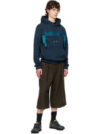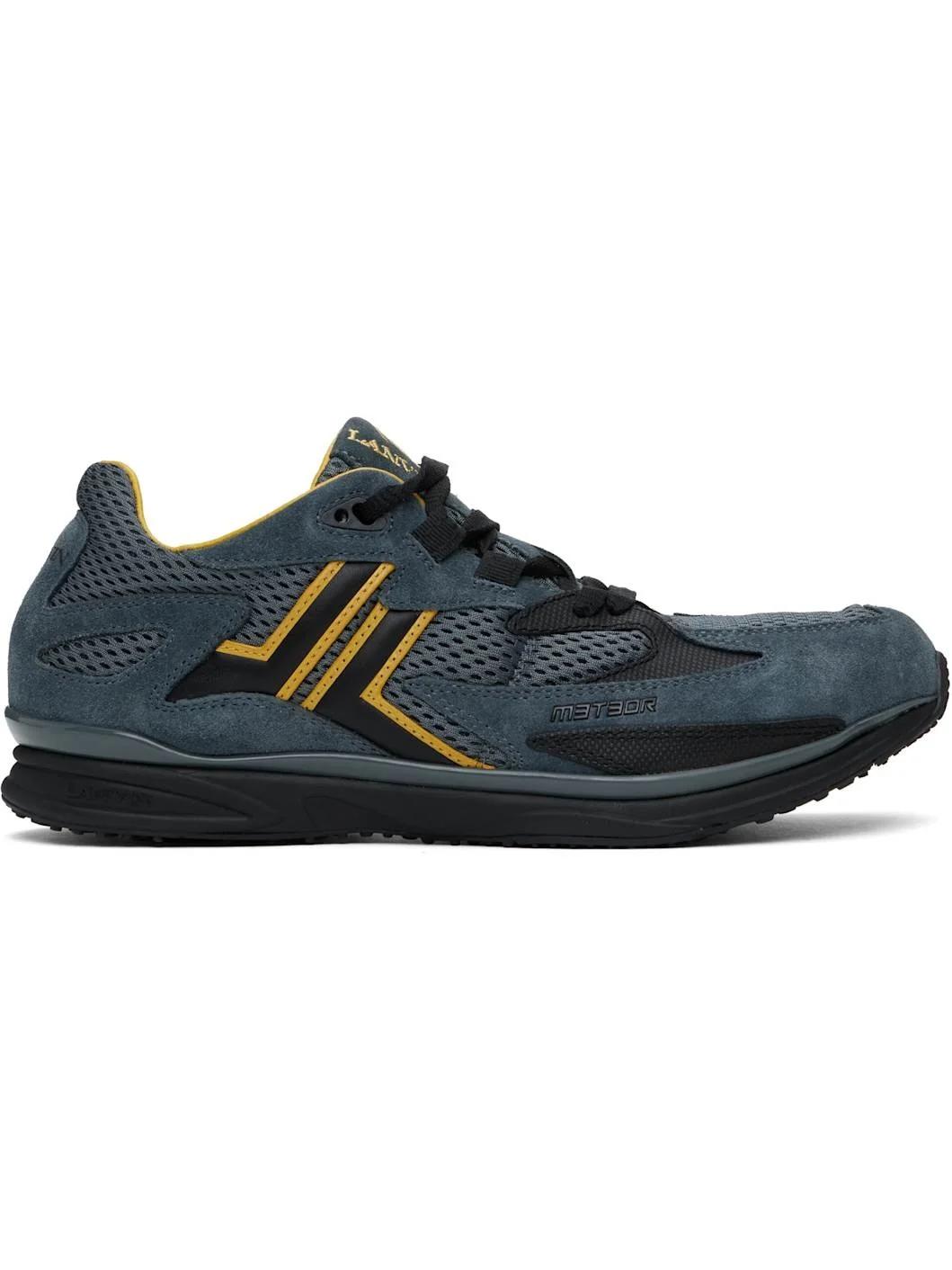 Low-top paneled goatskin suede, mesh, and bonded jersey sneakers in blue and yellow. · Lace-up closure · Logo embroidered at padded tongue · Padded collar · Text bonded at outer side · Logo bonded at heel tab · Buffed leather lining · Treaded rubber sole Supplier color: Steel/Daffodil Upper: goatskin, textile. Sole: rubber. Made in Indonesia 251254M237005