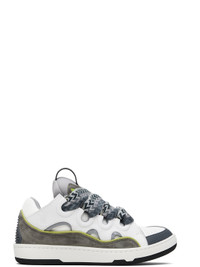 Low-top calfskin suede, nappa calfskin, and mesh sneakers. · Piping, cutouts, and rubberized trim throughout · Perforations at toe · Logo embossed at toe and outer side · Lace-up closure · Logo plaque and pull-loop at tongue · Padded tongue and collar · Jersey lining · Treaded rubber sole Supplier color: White/Grey Upper: calfskin, textile. Sole: rubber. Made in Portugal 252254M237060