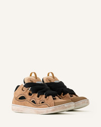 The Curb sneaker embodies the vibrant spirit of the 90s, with its bold, oversized silhouette. It embodies several of the House's signatures: Contrast, with a variety of materials, textures and colors. The ribbon, which represented the bond between a mother and daughter for Jeanne Lanvin, with oversized laces made in Greece, double waxed and featuring a chevron motif. And finally, the Circle, with rounded lines, an architectural detail inspired by Art Deco. The fabric of this model features topstitched details and its sole has been treated to achieve a clay court effect. Details - Curb canvas sneakers with topstitching - Waxed and woven double laces with a herringbone motif - Quilted tongue with the Lanvin label and an embossed Mother and Daughter logo - Exclusive worn-effect rubber sole - Made in Portugal Size & fit - This style fits true to size, you may take your usual size. - The size displayed corresponds to a French size SKU: FU-SKDK12-CANV-P2666S341