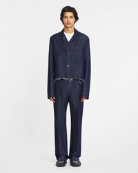 Details - Japanese denim jacket with raw hems and pleats made by laser - Color: Navy Blue - Made in Italy Size and fit - The model is 186 cm / 6'1'' tall - He wears a size 46 Composition - Main Material: 60% Cotton, 40% Linen Cleaning and care - Requires very delicate care - Turn inside out before cleaning - Have cleaned by a luxury dry cleaning specialist only SKU: RM-JA0128-D060-E232946