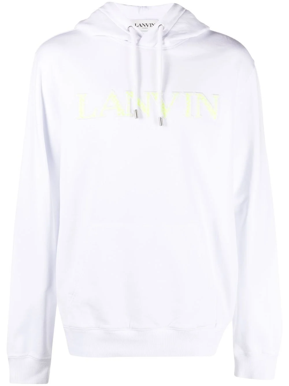 embroidered-logo pouch-pocket hoodie Lanvin boasts signature traits with this white hoodie. Featuring the Maison's logo embroidered at the chest in fluorescent yellow fabric, the garment is made instantly recognisable to the brand. Imported Composition Cotton 100%, Polyester 100% Washing instructions Machine Wash