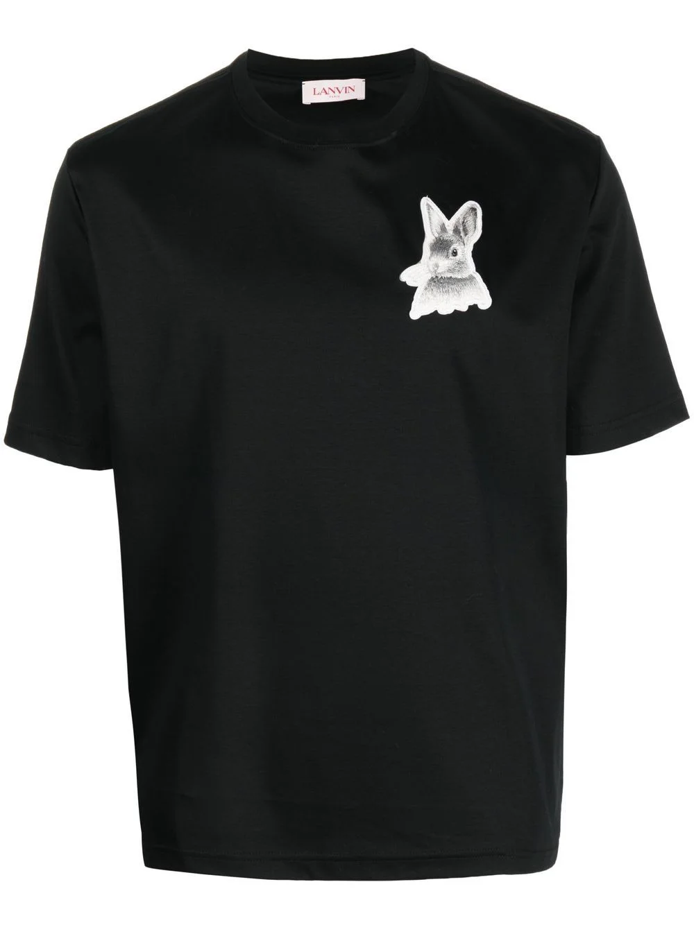 L rabbit patch T-shirt Crafted from soft cotton, this simple black cotton T-shirt from Lanvin is enhanced by the brand's exclusive L rabbit embroidered patch on the front for a playful touch. Made in Italy Composition Cotton 100% SIZE & FIT Model measurements Height 6 ft 2 in(1.88 m) Bust/Chest 36.61 in(93 cm) Hips 35.82 in(91 cm) Waist 27.95 in(71 cm) Measurement CHEST 41.73 in(106 cm) FittingInformation This piece fits true to size. We recommend you get your regular size Cut for a relaxed fit Made with a mid-weight fabric Washing instructions Machine Wash