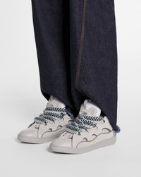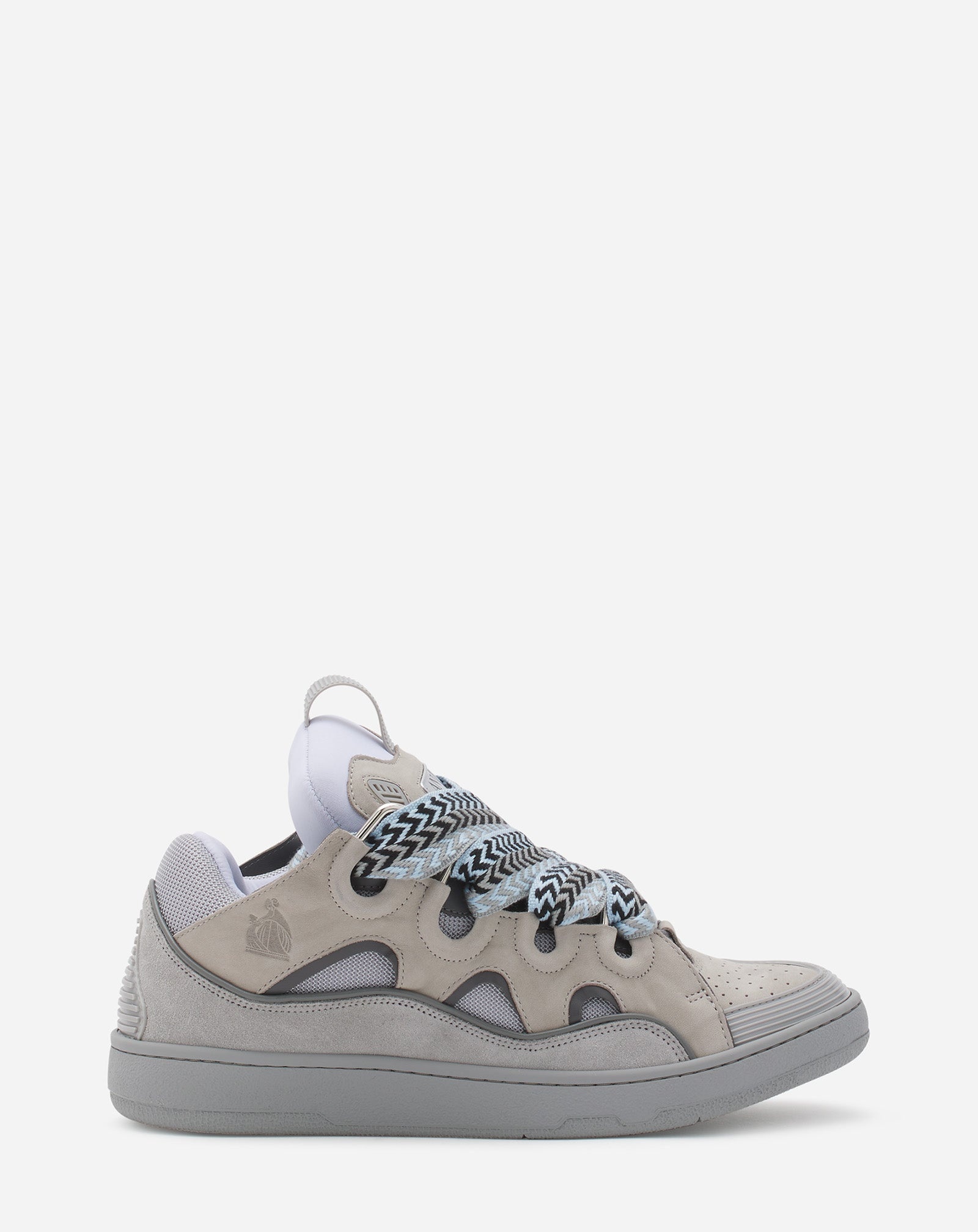 The Curb is a sneaker inspired by the 90s, with a confident design and exaggerated dimensions. Made in nappa calfskin, suede and mesh, this elaborately constructed shoe stands out for its extraordinary comfort thanks to the rounded shape, padded tongue, and metallic eyelets. Details - Leather Curb sneakers - Color: Gray - Made in Portugal Size and fit - Quilted tongue with Lanvin label and embossed Mother and Child logo - Double waxed and woven herringbone laces Composition - Main material: Calfskin - Material 2: Calfskin - Material 3: Woven polyester - Lining: 82% woven polyester, 18% Elastane - Sole: Rubber Cleaning and care - Clean gently with a soft cloth or bristled brush without products. - Store in a dry, dark place in their original packaging. SKU: FM-SKRK11-DRAG-A231339