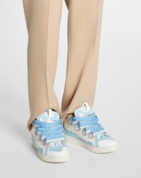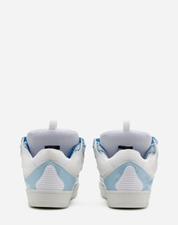 The Curb is a sneaker inspired by the 90s, with a confident design and exaggerated dimensions. Made in nappa calfskin, suede and mesh, this elaborately constructed shoe stands out for its extraordinary comfort thanks to the rounded shape, padded tongue, and curved metallic eyelets. Details - Leather and technical material Curb sneakers - Colors: Lanvin Blue - Quilted tongue with Lanvin label and embossed Mother and Child logo - Double waxed and woven herringbone laces - Transparent sole - Made in Portugal Composition - Main material: 100% calfskin - Material 2: 100% polyester weave - Material 3: 95% TPU, 5% polyurethane - Lining: 82% polyester weave, 18% Elastane - Sole: Rubber Cleaning and care - Clean gently with a soft cloth or bristled brush without products. - Store in a dry, dark place in its original packaging. SKU: FM-SKRK11-GLOS-A2220139